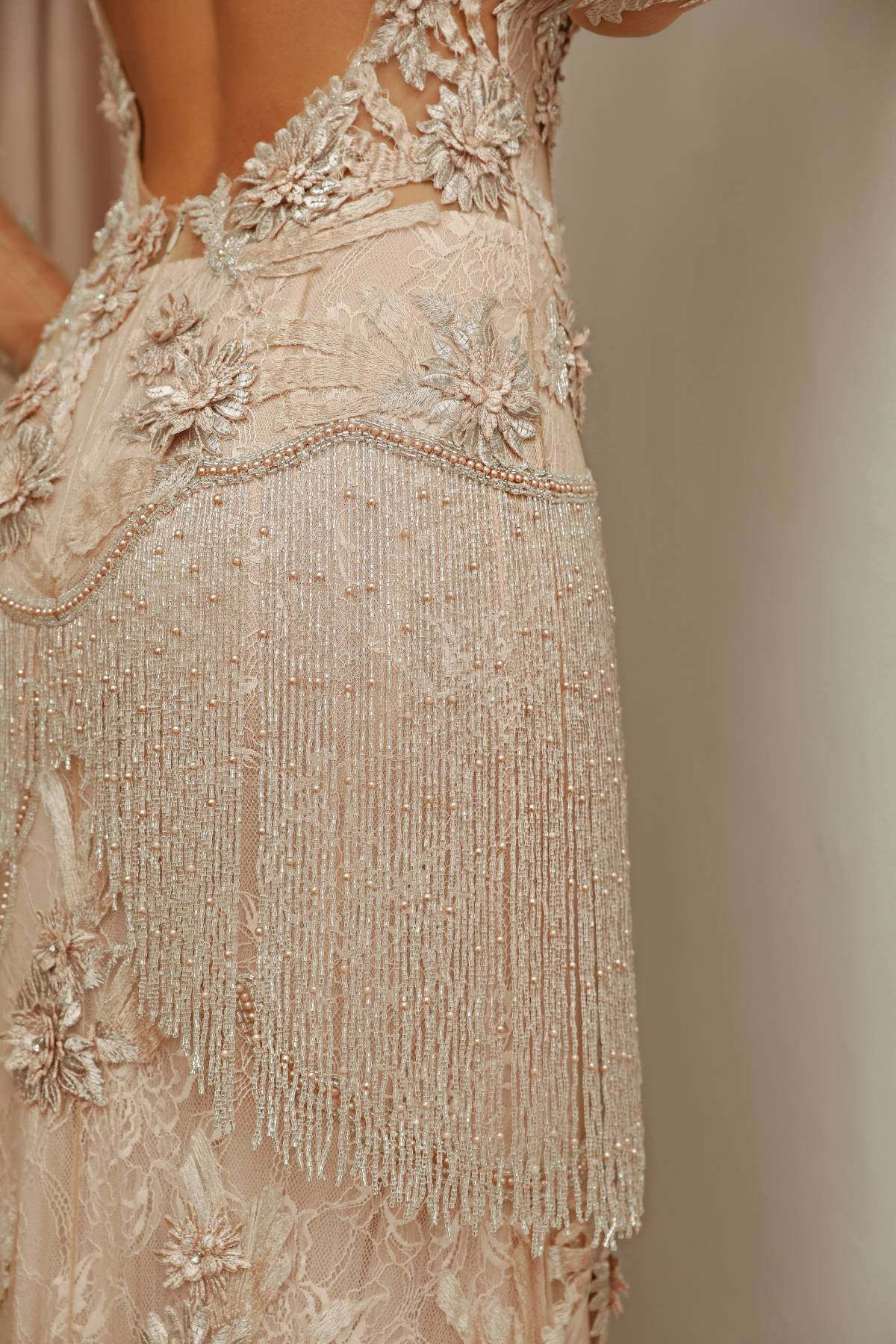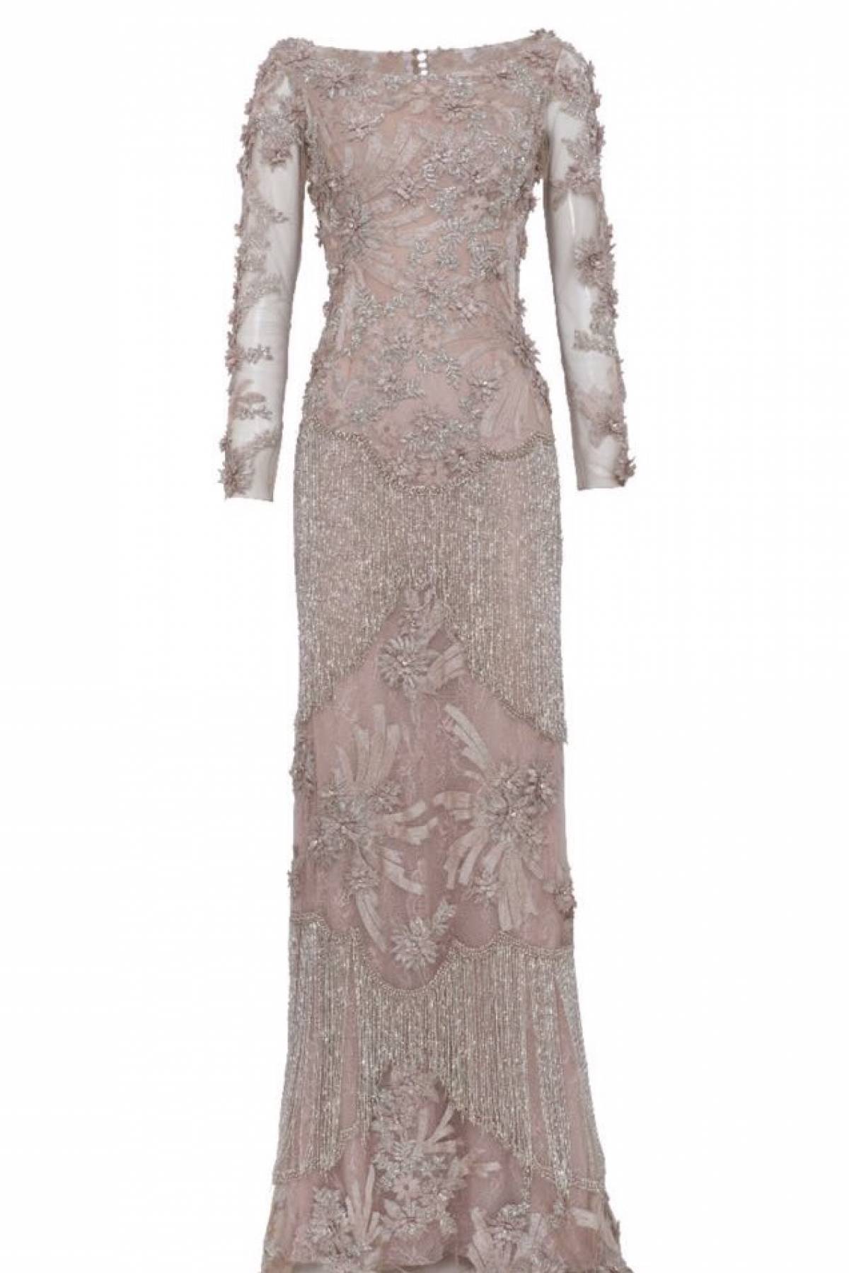 Descrição:Vestido longo rose todo de renda e manga longa bordado em prata com franjas.