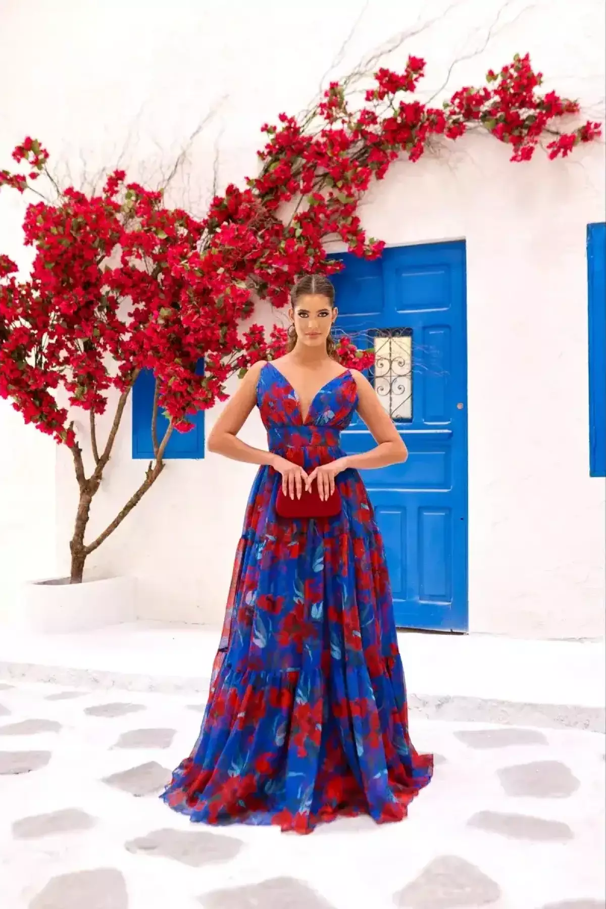 Descrição:Vestido longo em alfaiataria, estampado de amarelo com flores vermelhas.