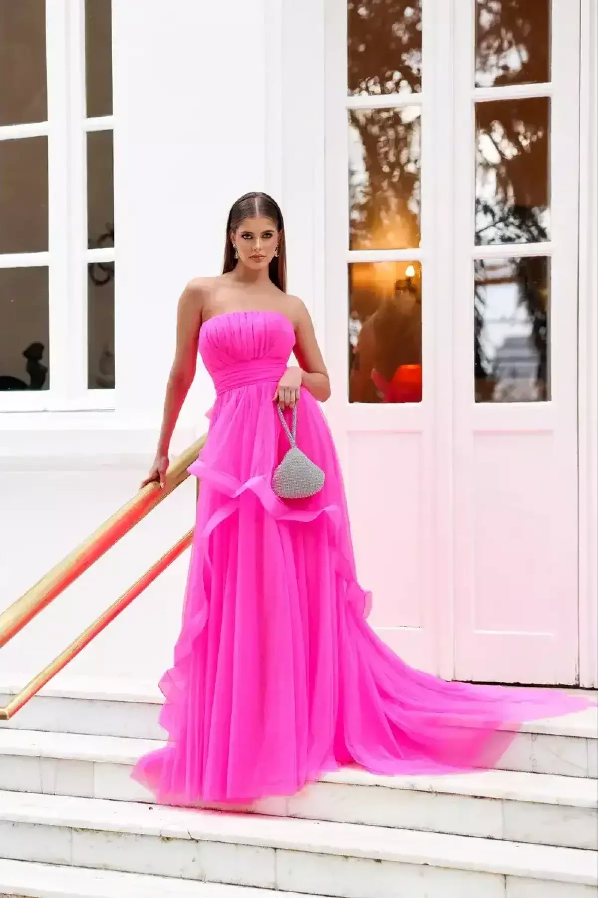 Descrição:Vestido com manga bufante e recortes nas laterais fúcsia.