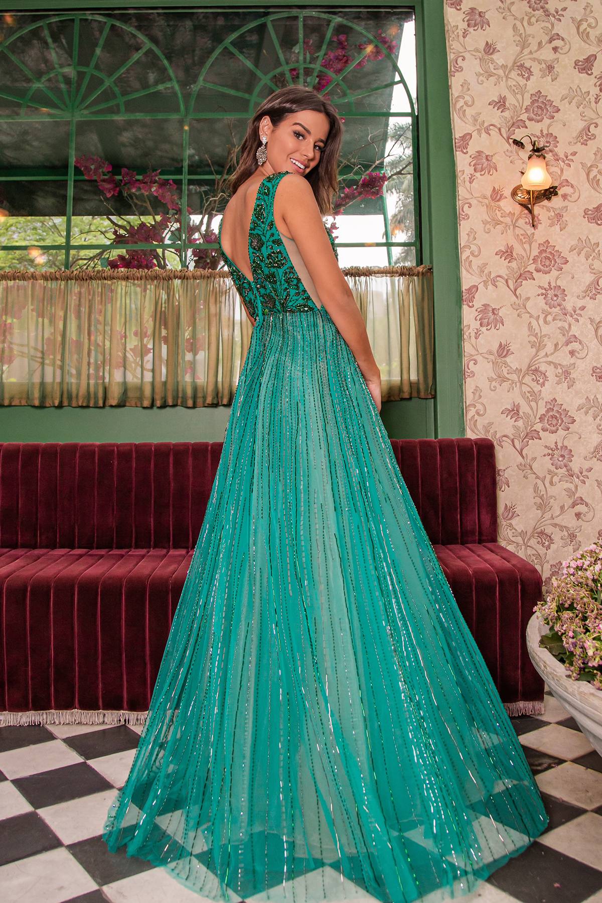 Descrição:Vestido verde esmeralda todo bordado com saia rodada em crinol.