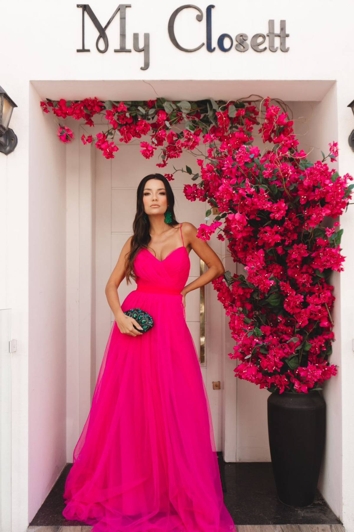 Descrição:Vestido longo, pink, inteiro de tule, saia ampla, com fenda