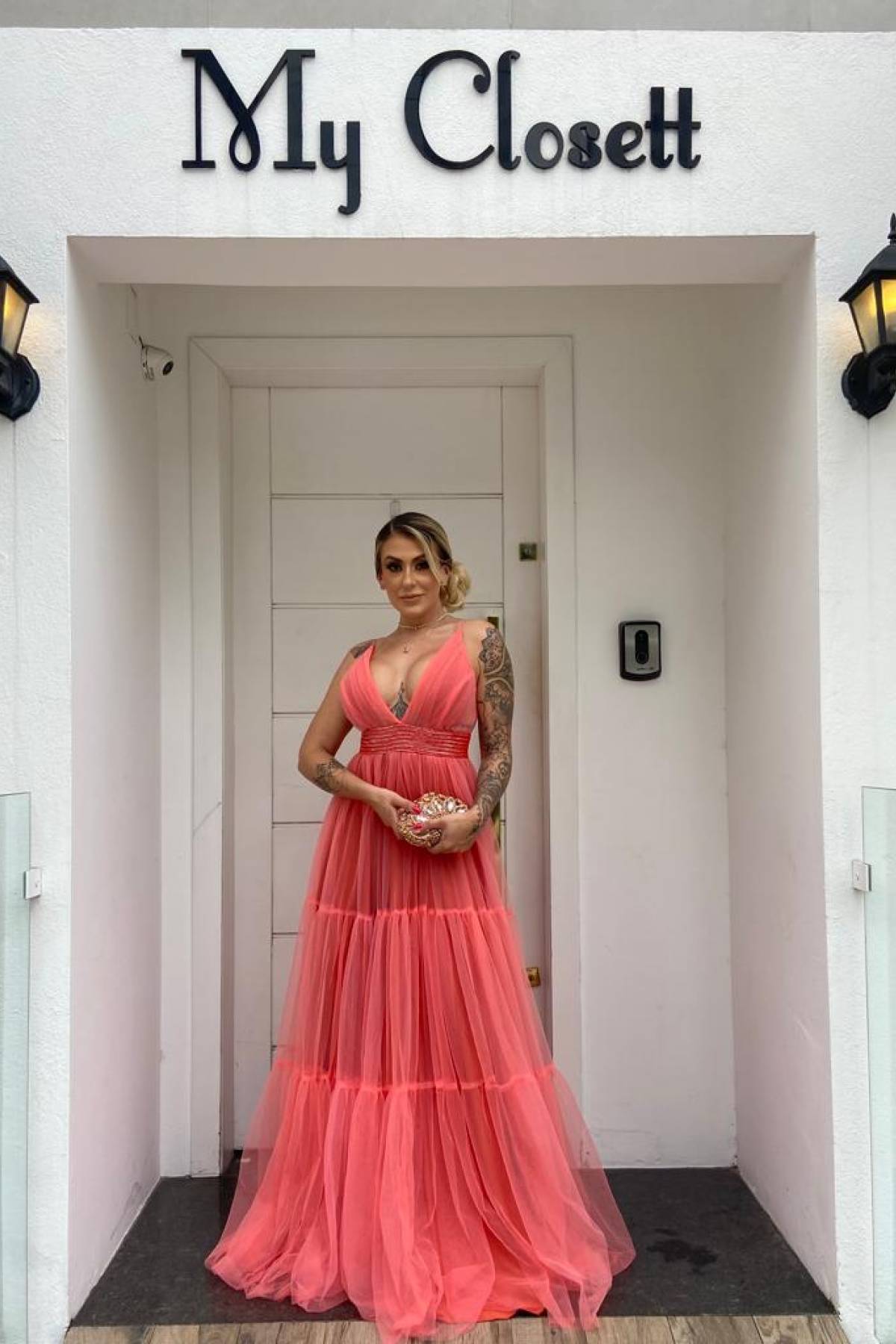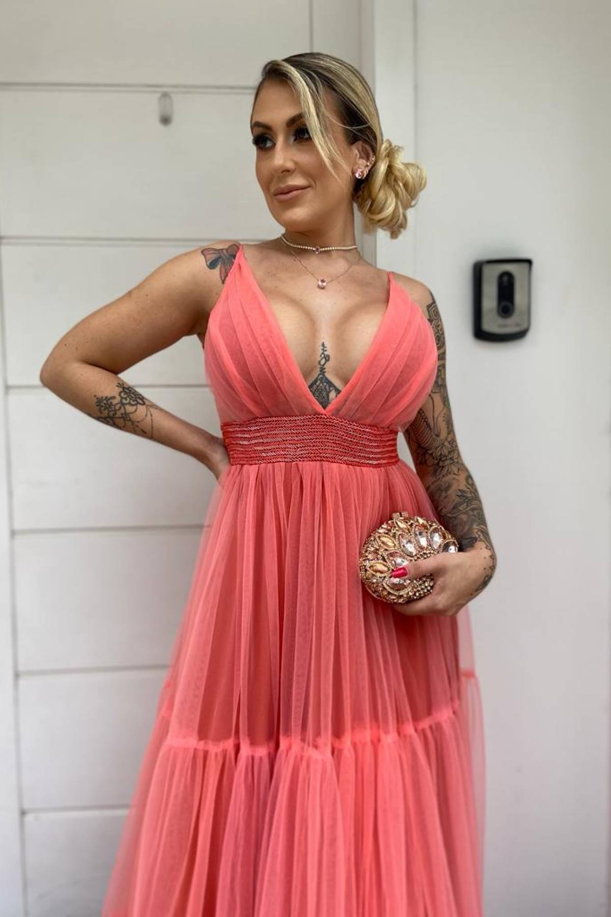 Descrição:Vestido longo, coral, todo em tule com faixa bordada na cintura