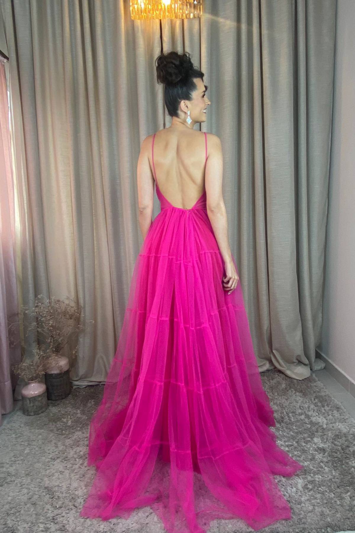 Descrição:Vestido longo, inteiro de tule, semi bordado, pink, saia ampla