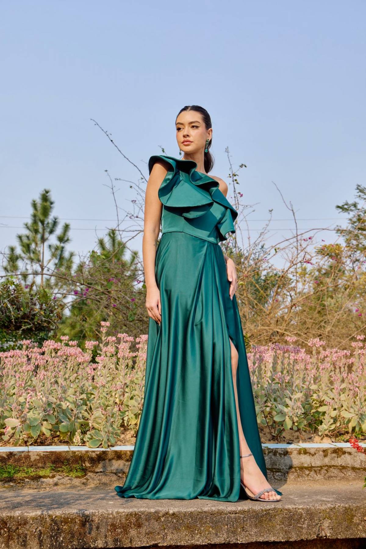 Descrição:Vestido coral de ombro só, saia de babado balonê
