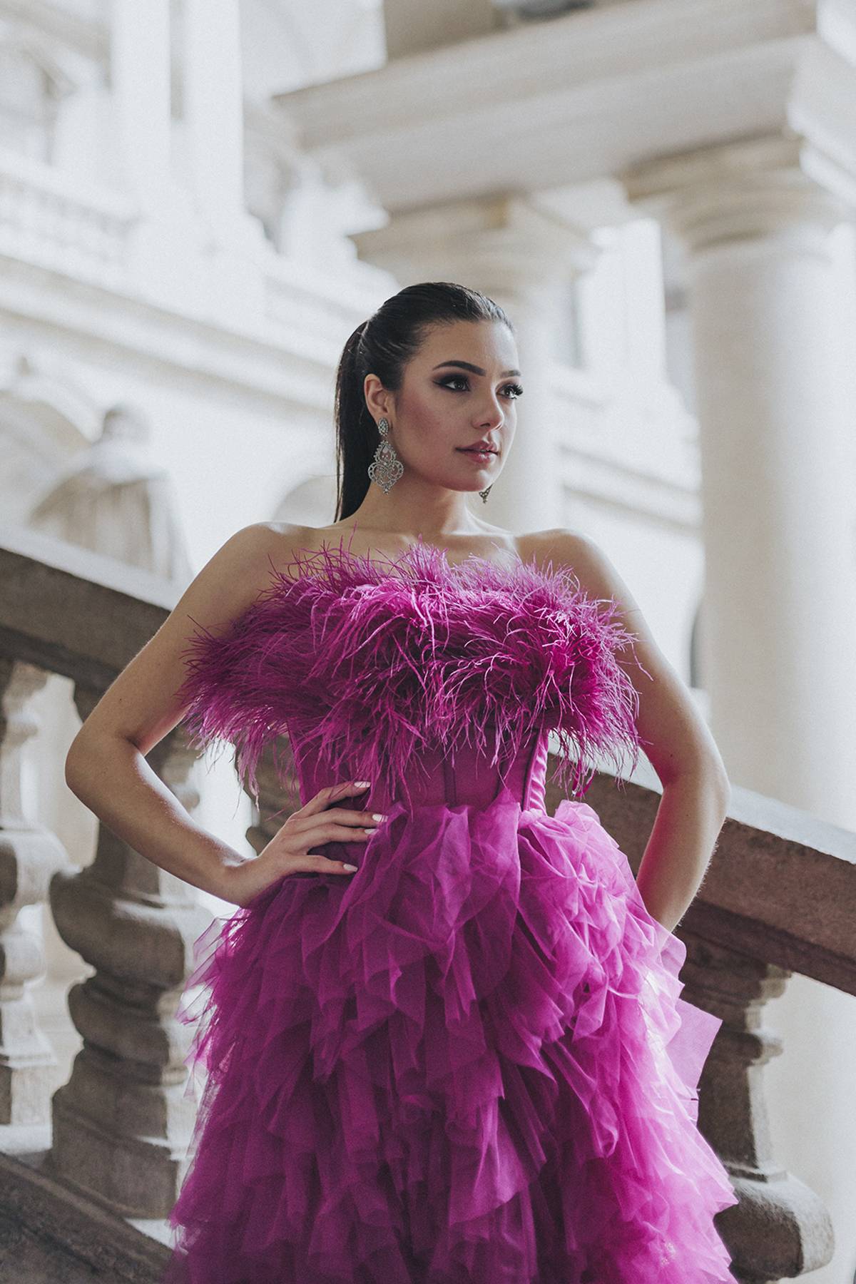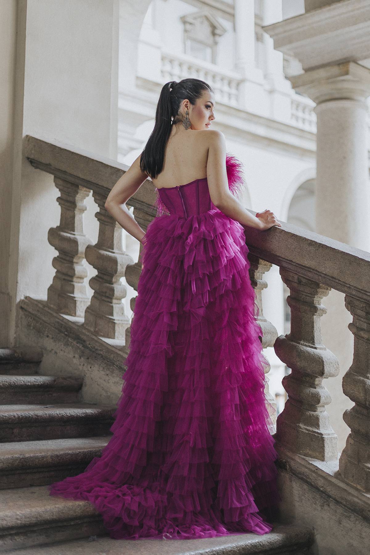 Descrição:Vestido Vivace Collection. Vestido em tule italiano fucsia com saia assimétrica. Tomara que caia, com plumas e fenda.