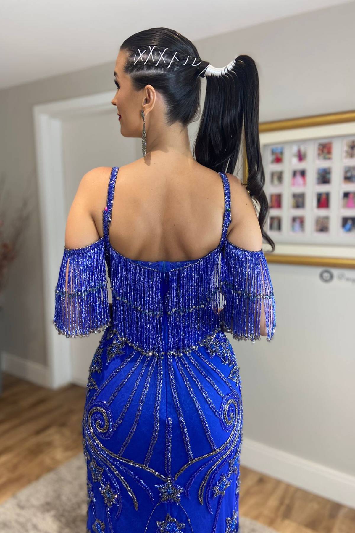 Descrição:Vestido longo, azul bic / royal inteiro bordado, opção de franjas na alça, sereia, busto corpete
