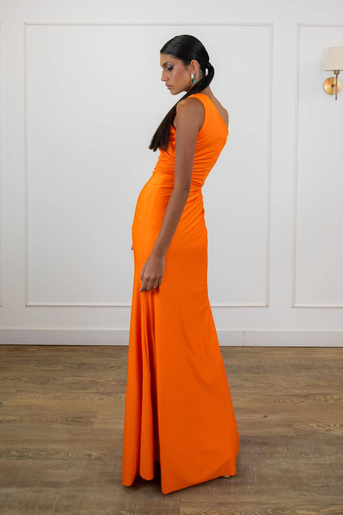 Descrição:Vestido laranja de um ombro só, com detalhe de nó na cintura.