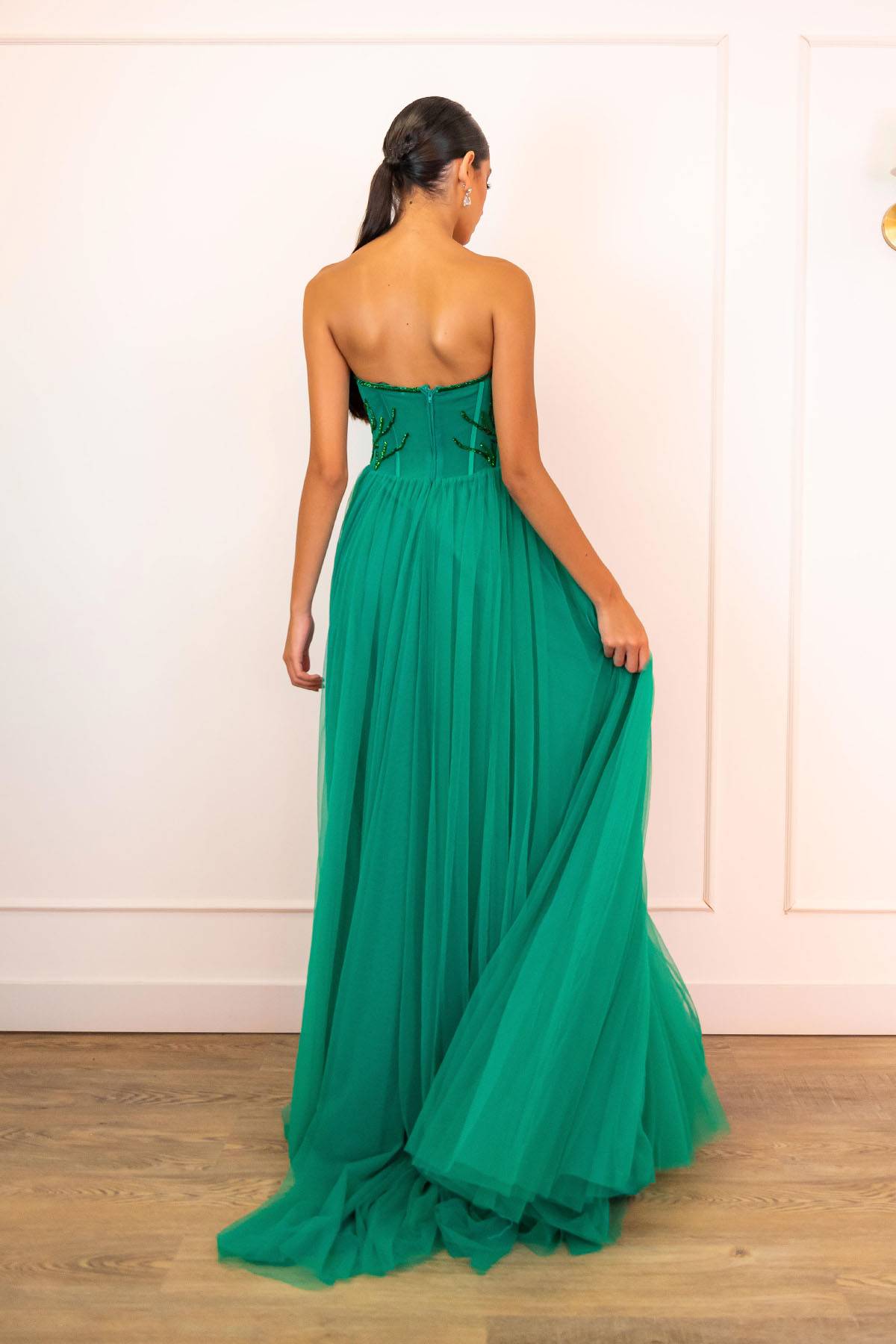 Descrição:Vestido verde em tule italiano e corpo bordado.