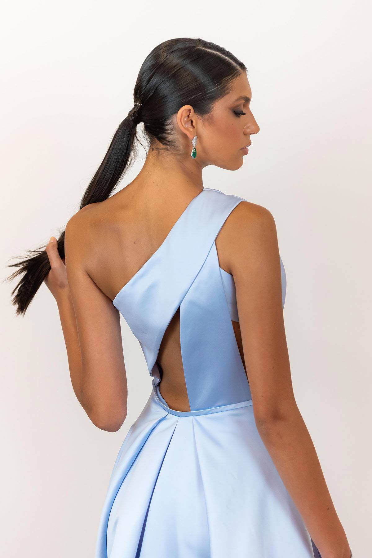 Descrição:Vestido longo azul Serenity de um ombro só e recorte na cintura.