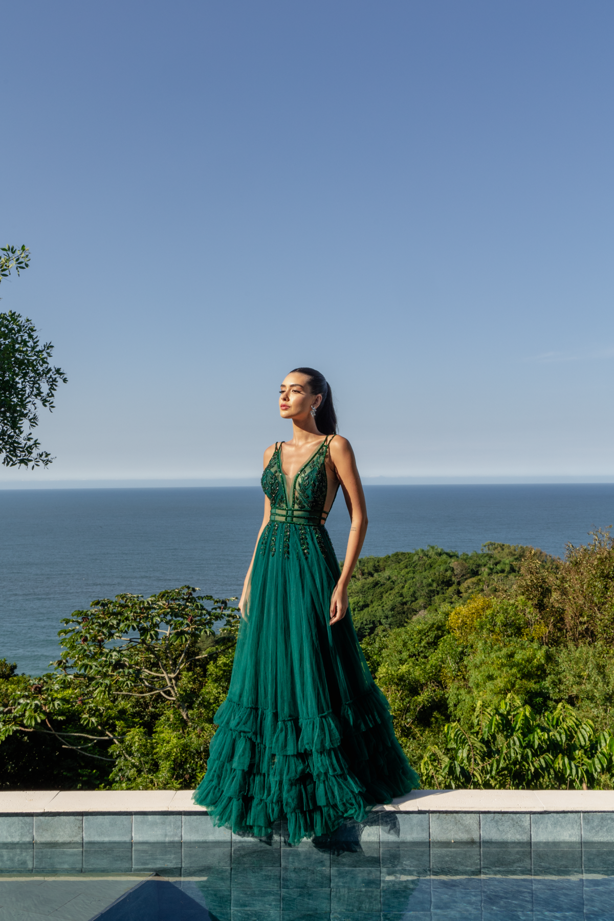 Descrição:Vestido longo, verde tiffany, tomara que caia, saia ampla, inteiro tule