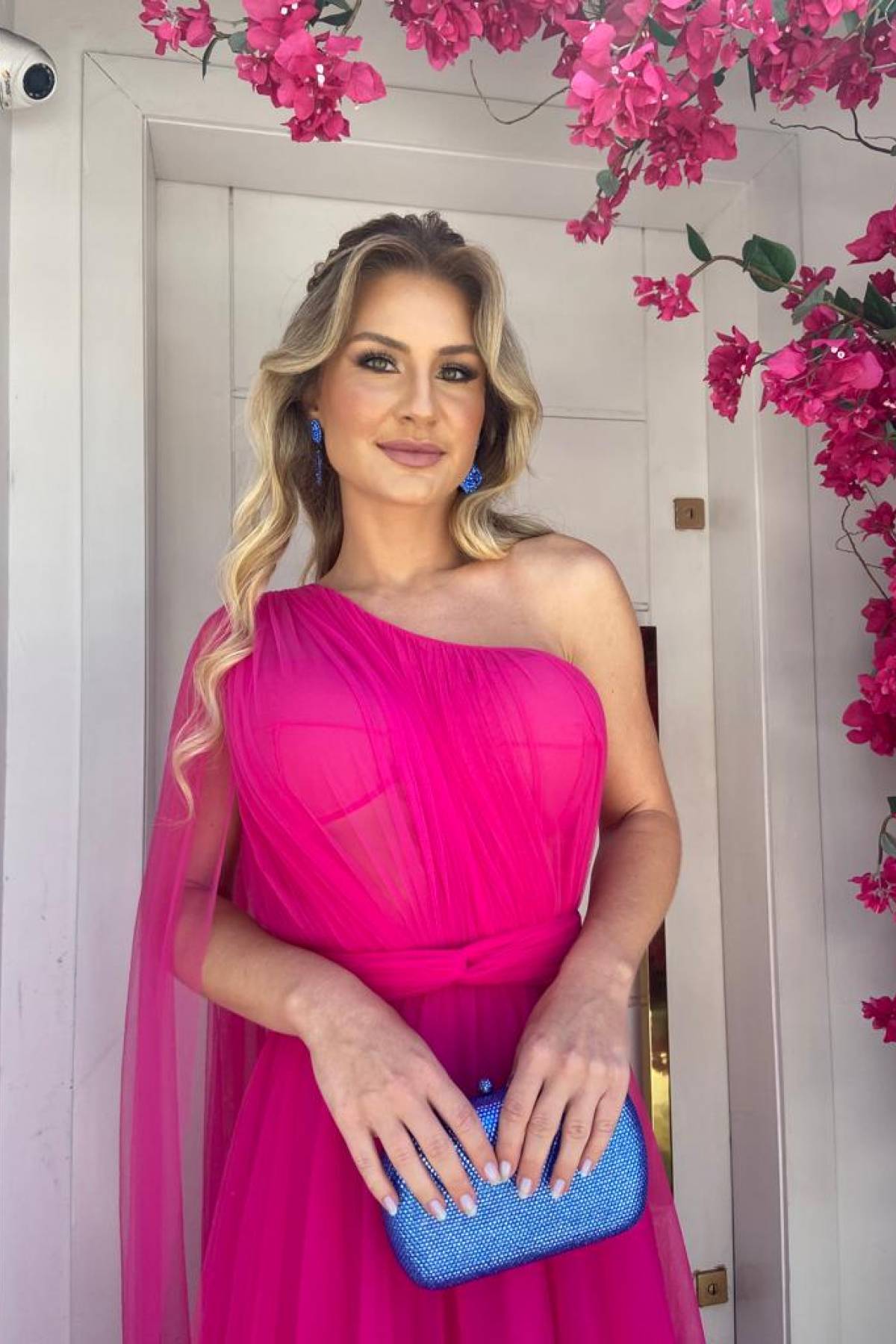 Descrição:Vestido longo, inteiro de tule pink, drapeado, um ombro só