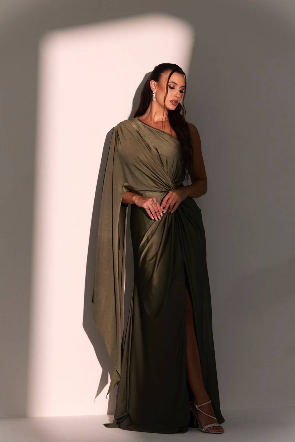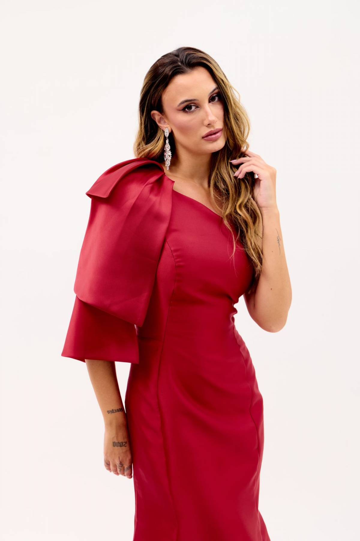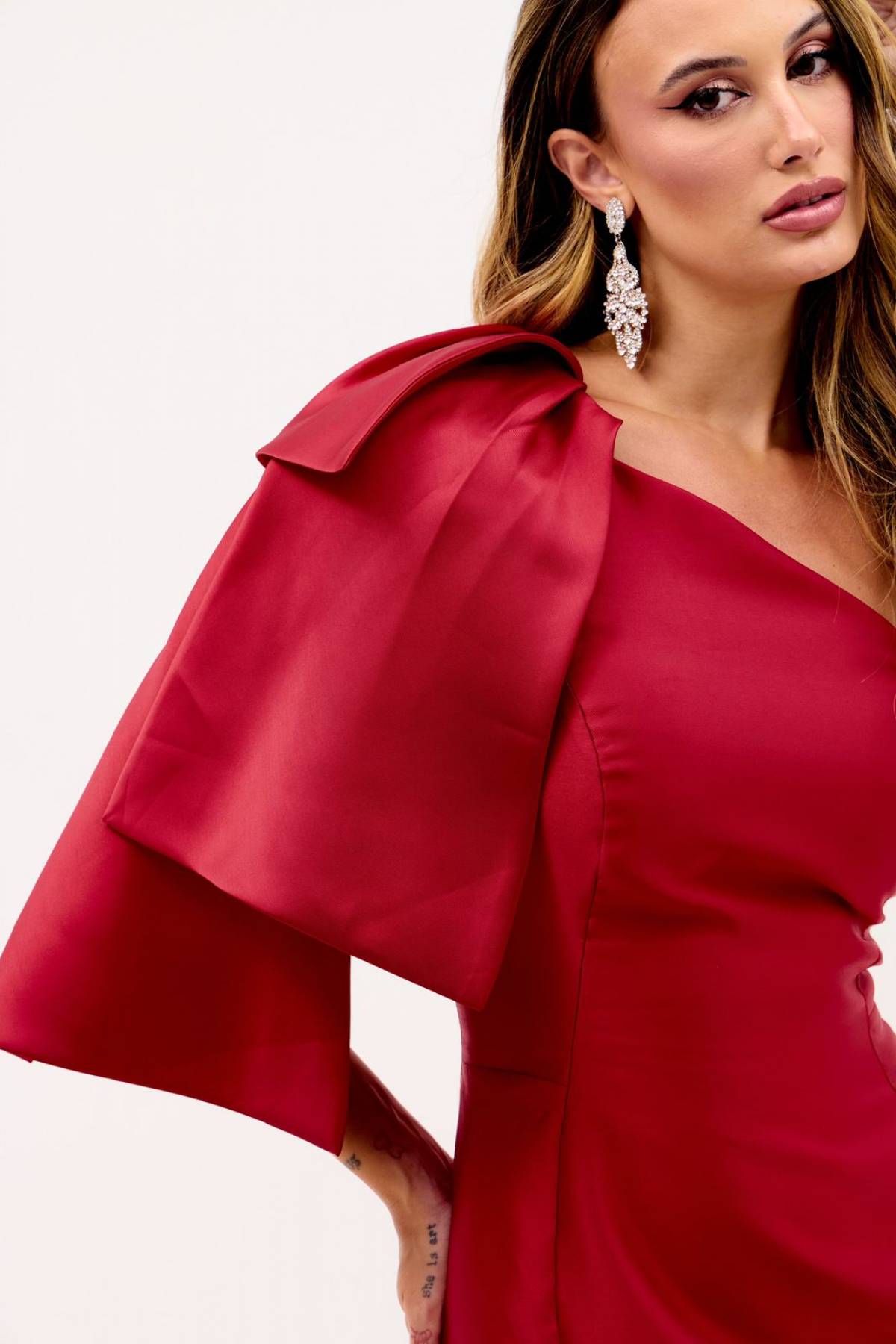 Descrição:Vestido longo vermelho, em alfaiataria, modelo sereia, um ombro só, com laço no ombro