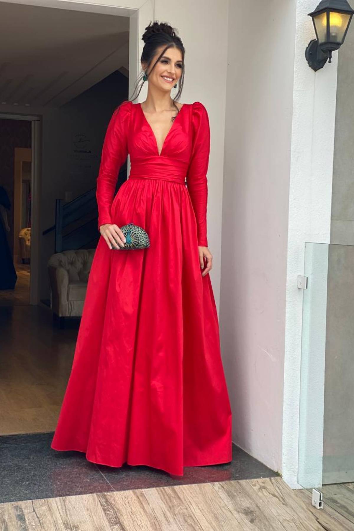 Descrição:Vestido longo, inteiro de glitter, vermelho, corpete com fenda