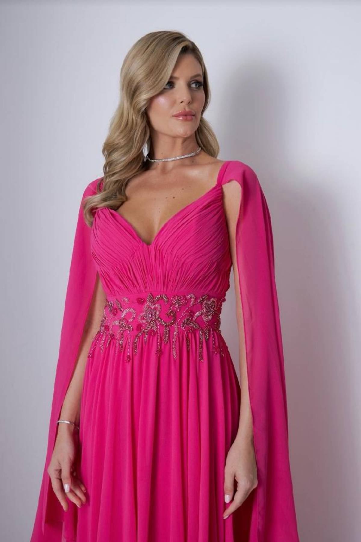 Descrição:Vestido pink liso, busto drapeado, manga capa, decote princesa