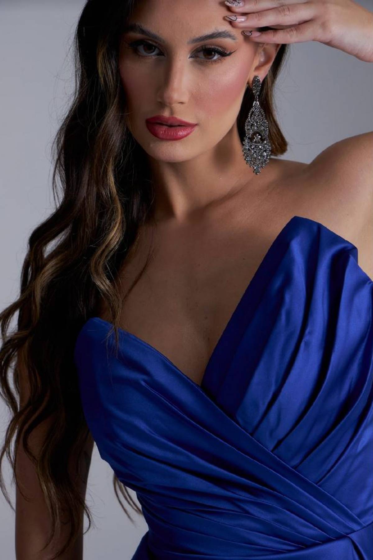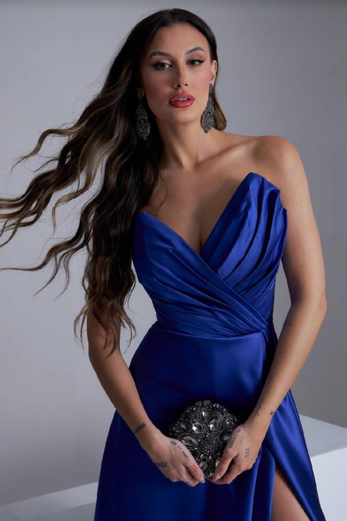 Descrição:Vestido longo azul royal, em alfaiataria liso, fenda, tomara que caia com detalhe drapeado, bolsos