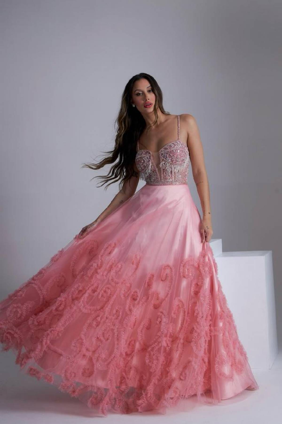 Descrição:Vestido curto inteiro bordado em pedrarias rose, franjas e brilho, saia lisa com detalhes de tule