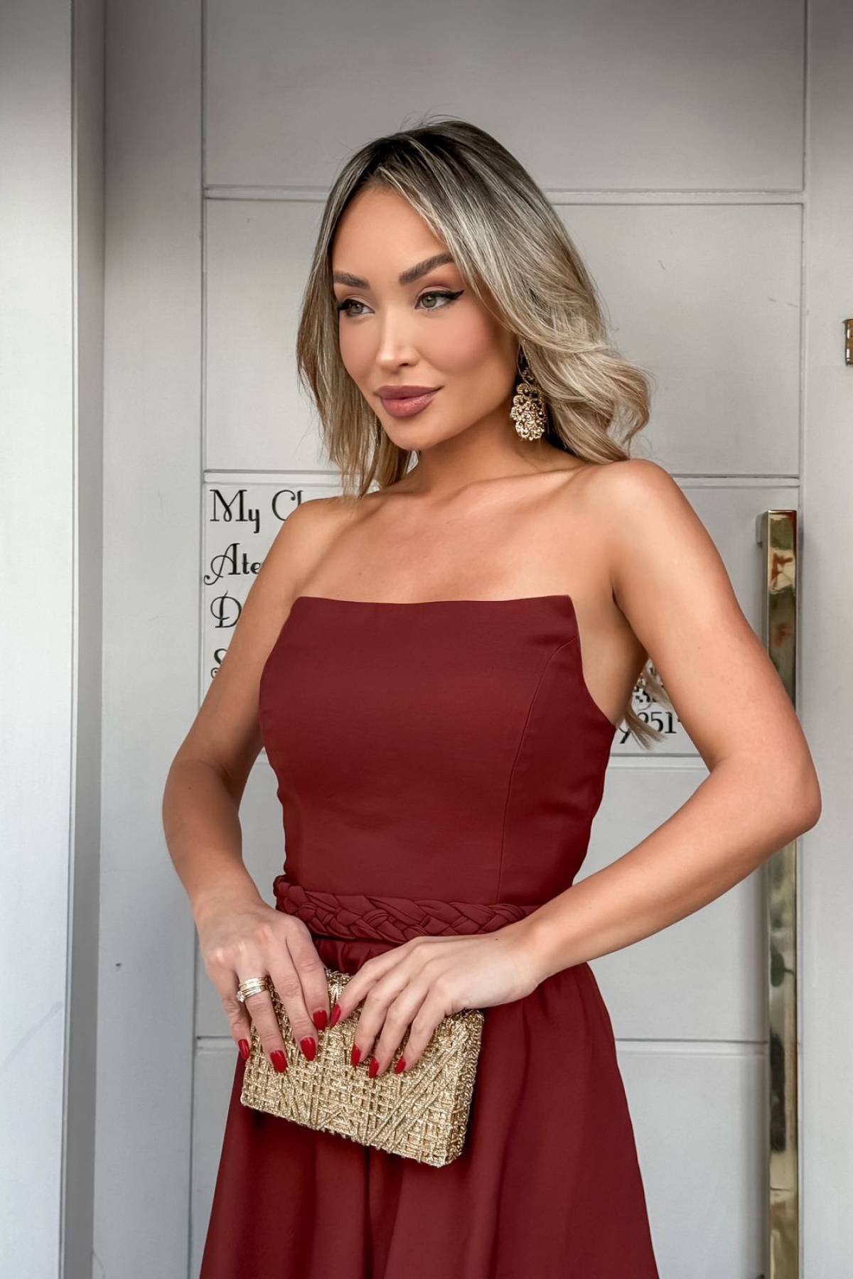 Descrição:Vestido longo terracota, saia em camadas, busto fechado