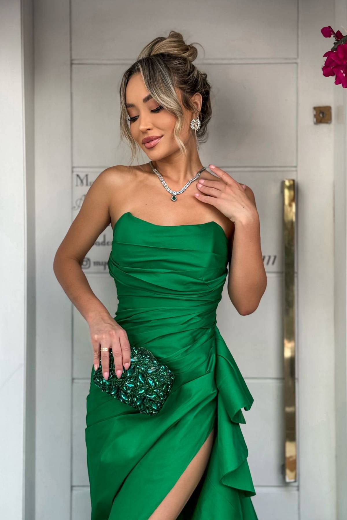 Descrição:Vestido longo verde, tafetá, sereia, cauda, fenda lateral, pregas
