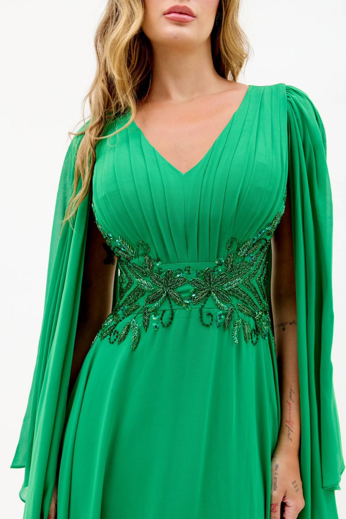 Descrição:Vestido longo verde bandeira / esmeralda, bordado cintura, mangas capa fluida, decote v .