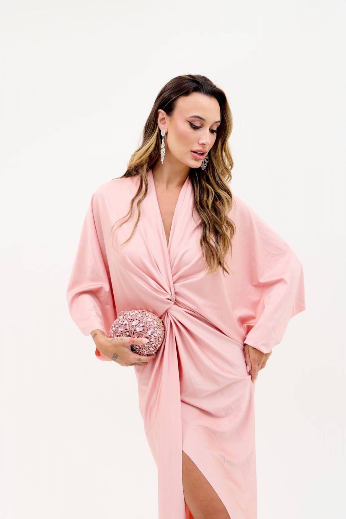 Descrição:Vestido longo rose, com manga capa, fenda frontal, nó e decote v