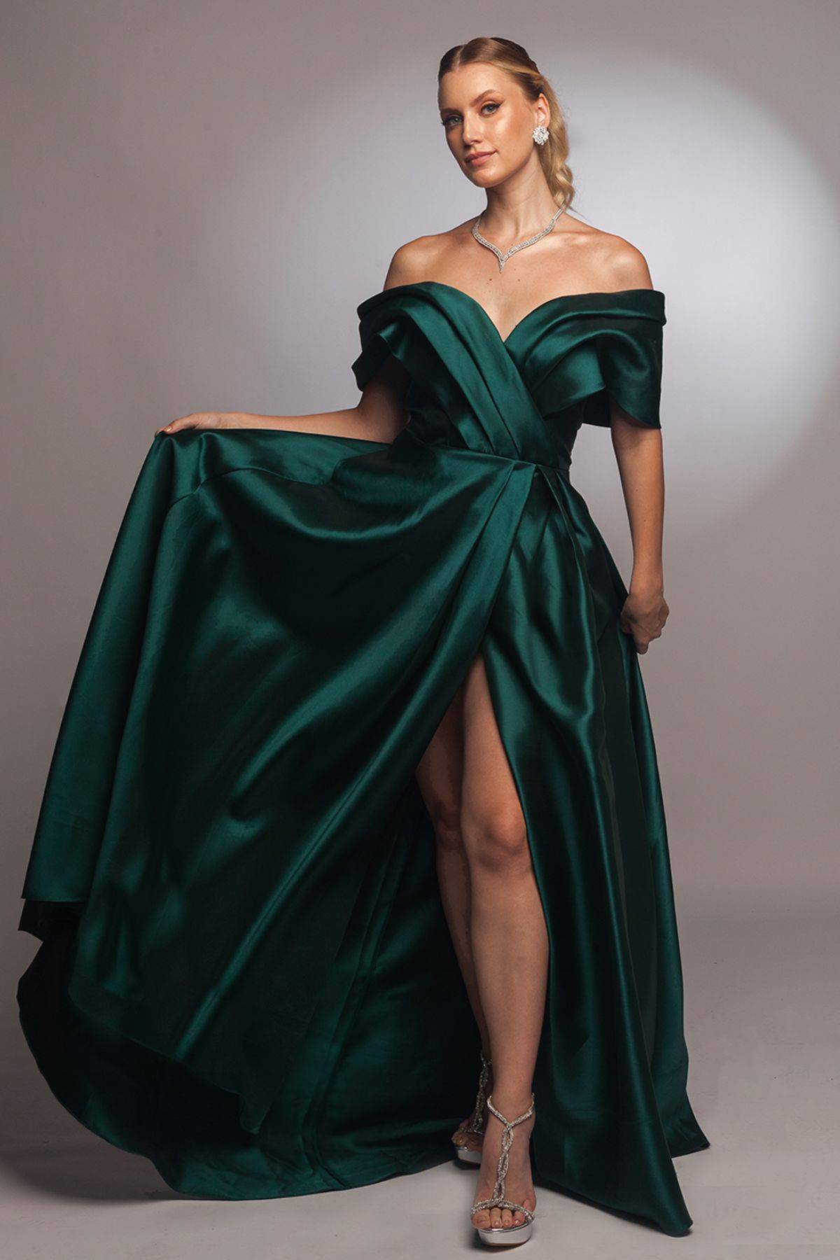 Descrição:Vestido verde esmeralda/petroleo, alfaiataria em cetim duchese, com detalhe ombro a ombro de manga bufante, saia ampla com fenda, decote coração.