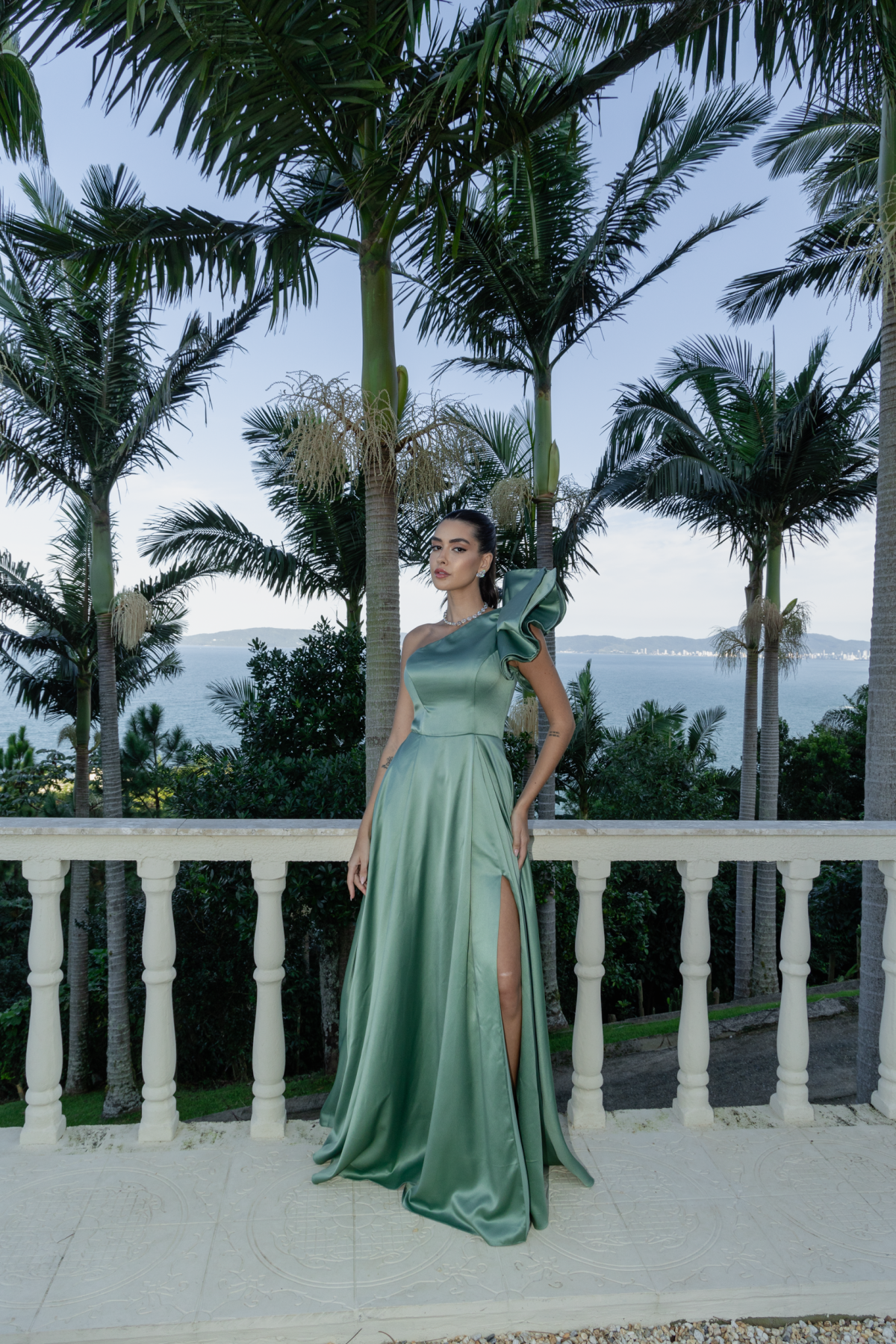 Descrição:Vestido longo liso em verde menta, cintura marcada, manga capa opcional