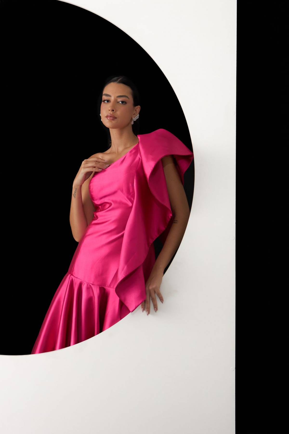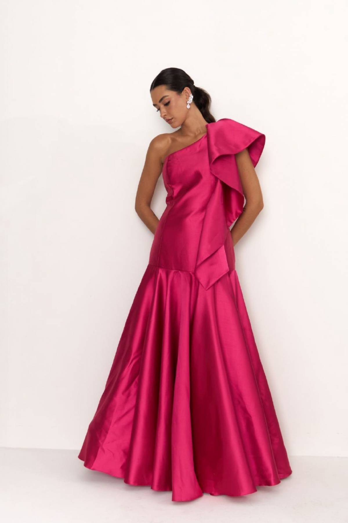 Descrição:Vestido longo liso, alfaiataria, laço no ombro, pink/vermelho