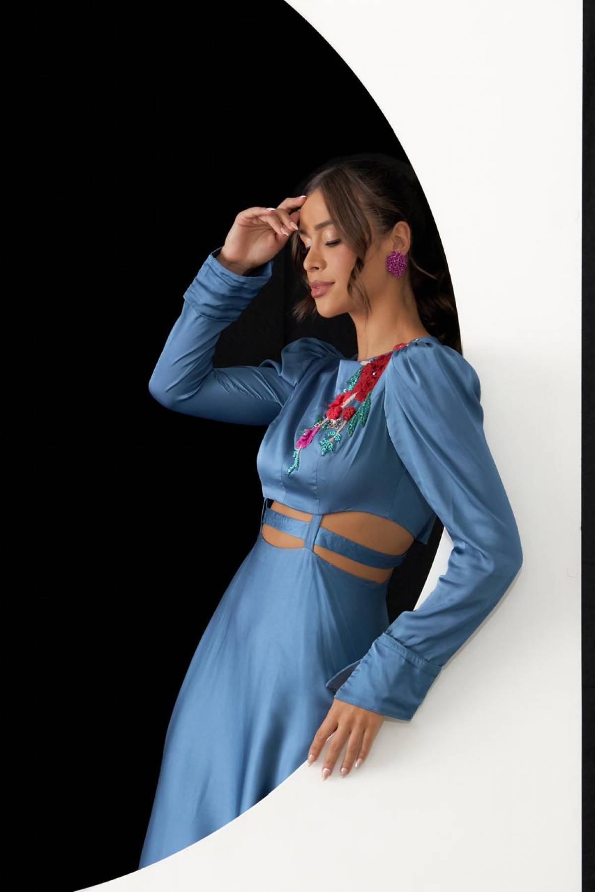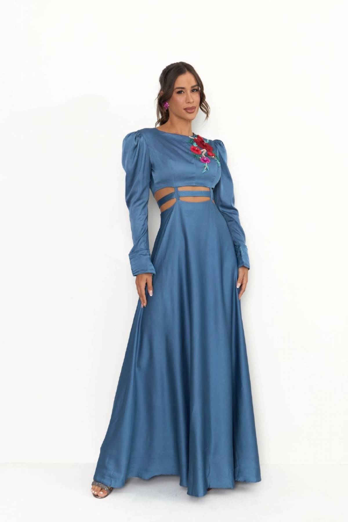 Descrição:Vestido azul cobalto/serenity de manga alfaiataria com cinto e bordado em plumas