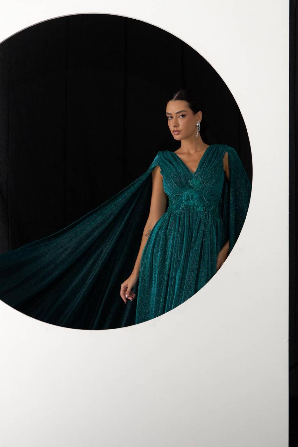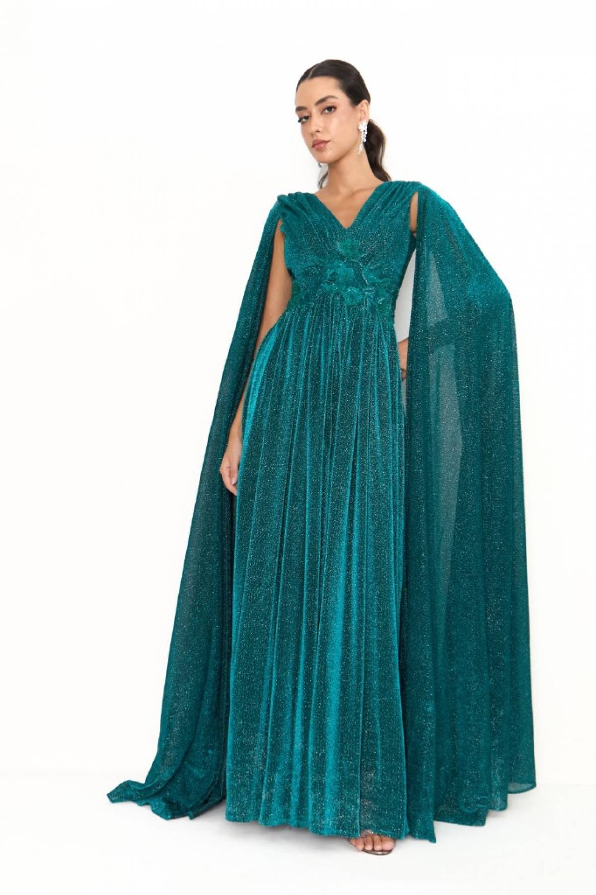 Descrição:Vestido longo, verde petroleo, tecido com brilho, lurex, manga capa opcional