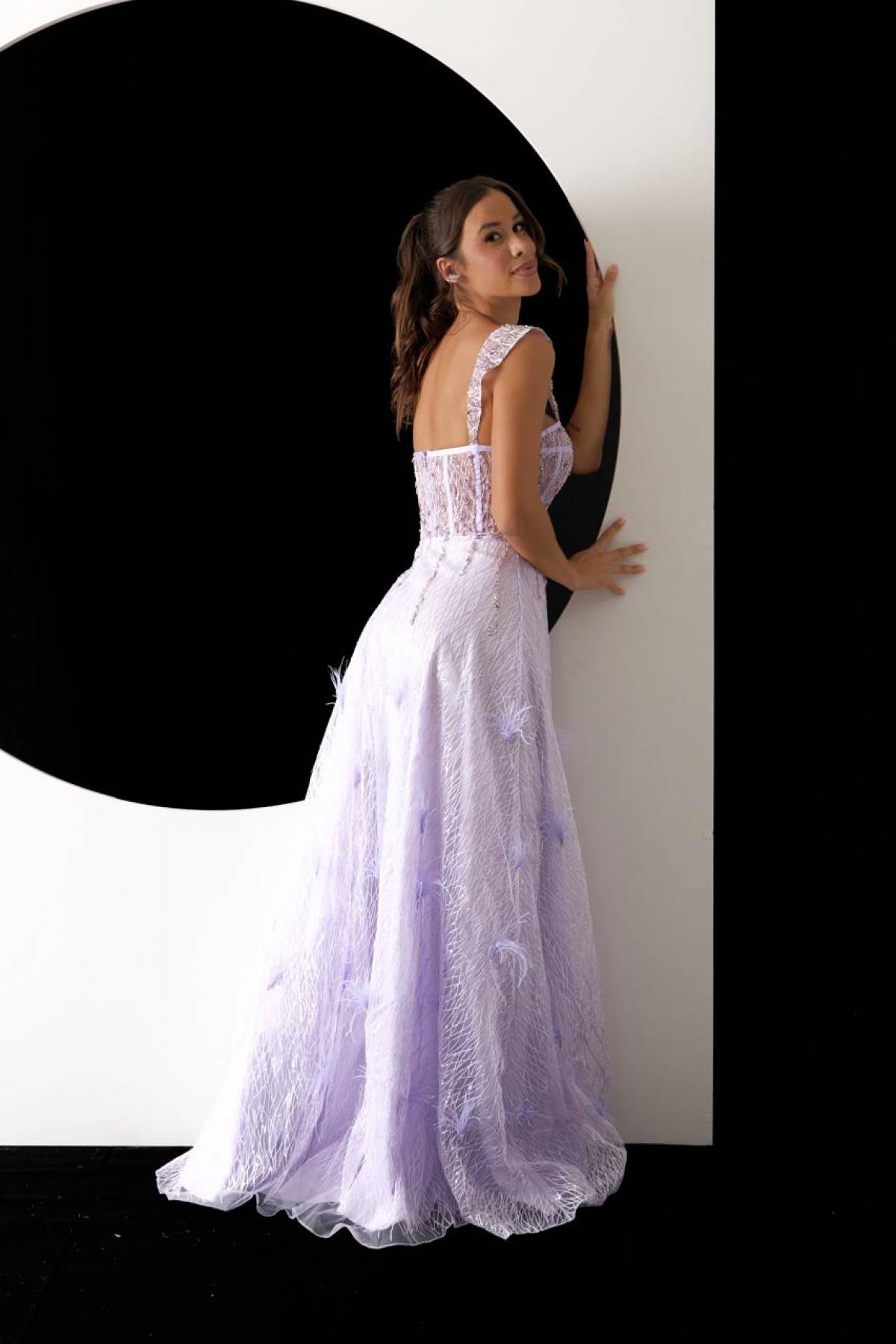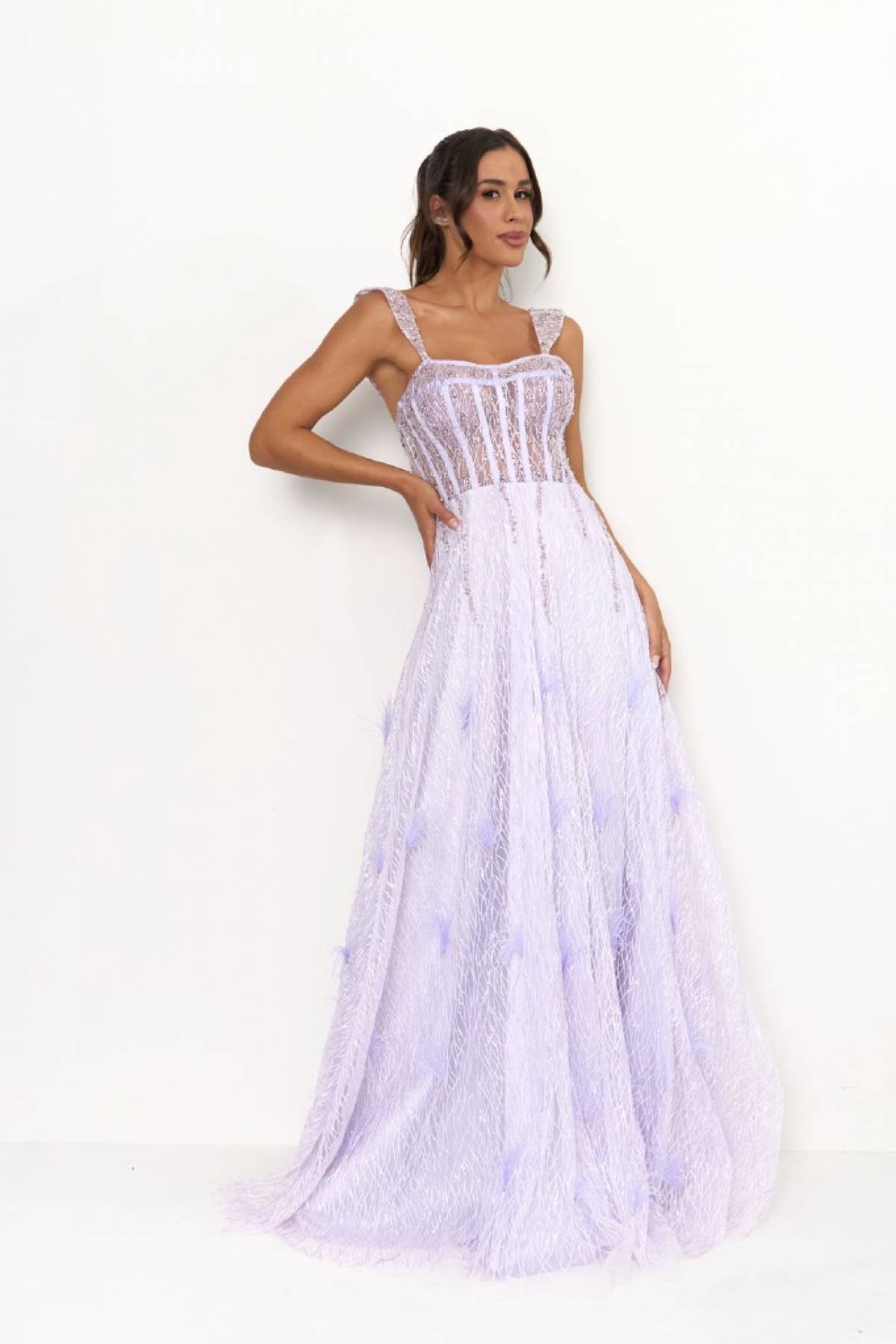 Descrição:Vestido longo lavanda, corset/corselet, semi bordado, aplicações de plumas na saia