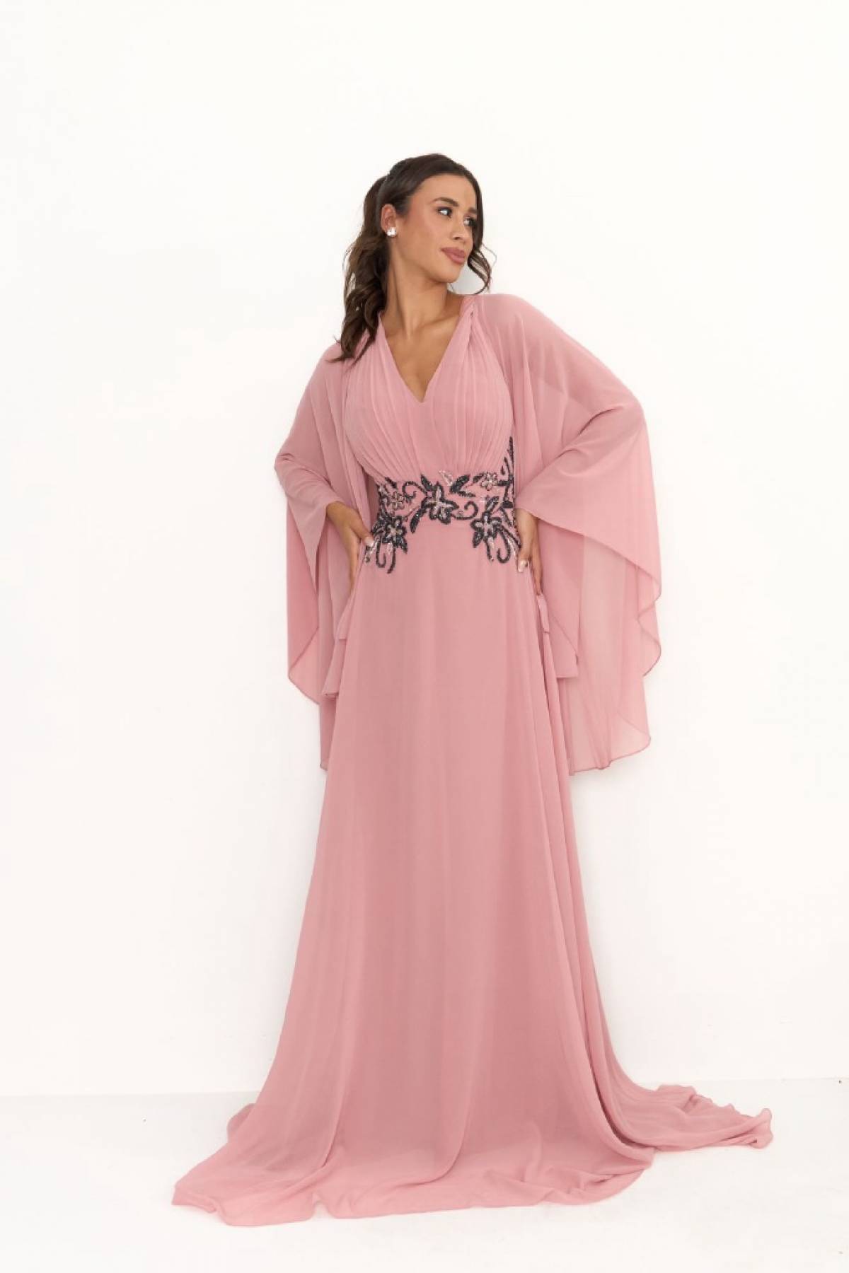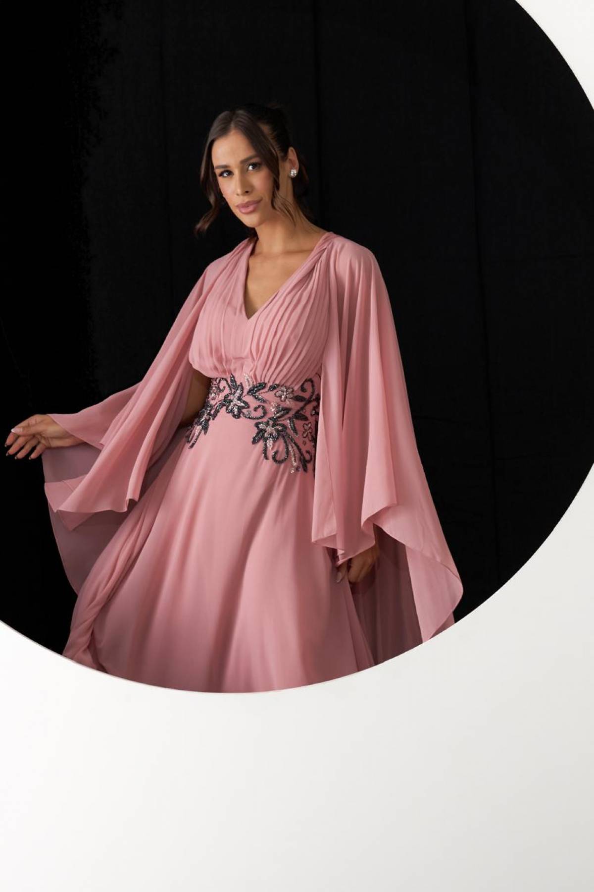 Descrição:Vestido longo rose, manga capa, decote v, bordado na cintura, drapeado no busto