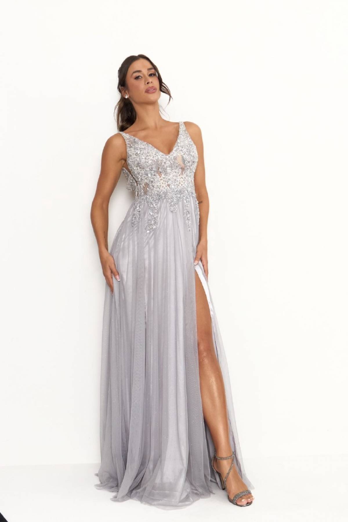 Descrição:Vestido longo em prata/chumbo/cinza , decote V, semi bordado a mão em renda e pedraria, saia ampla em tecido brilho de glitter, fenda