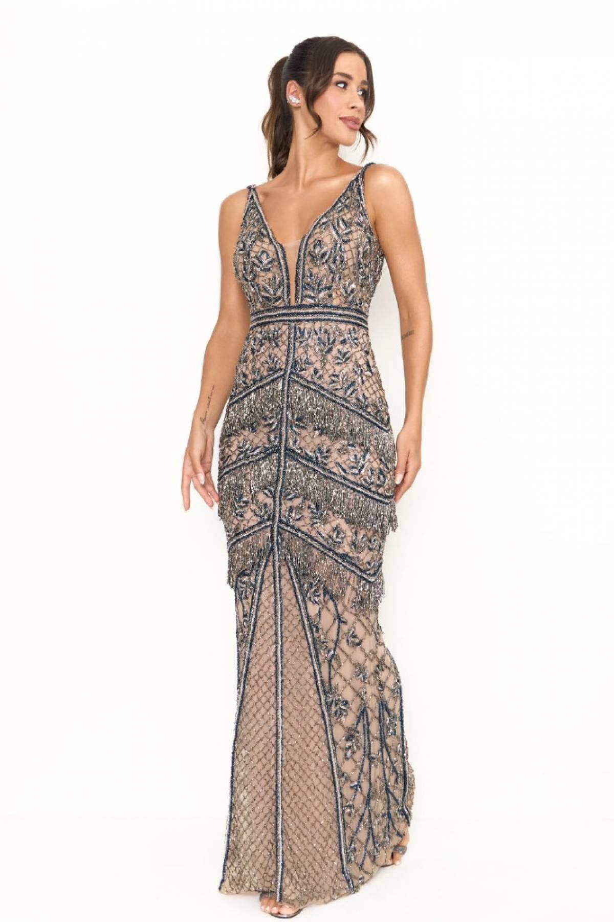 Descrição:Vestido longo, inteiro bordado, sereia, azul marinho e chumbo, alças finas, decote profundo, tiras nas costas, forro longo, mini franjas