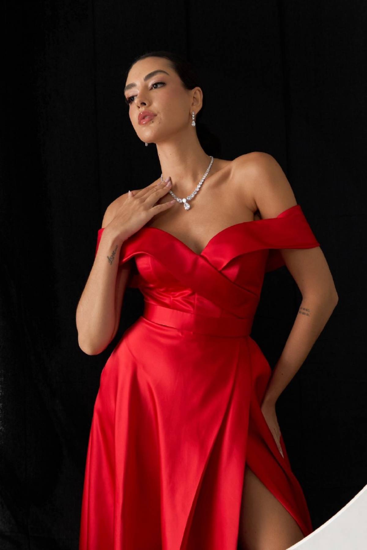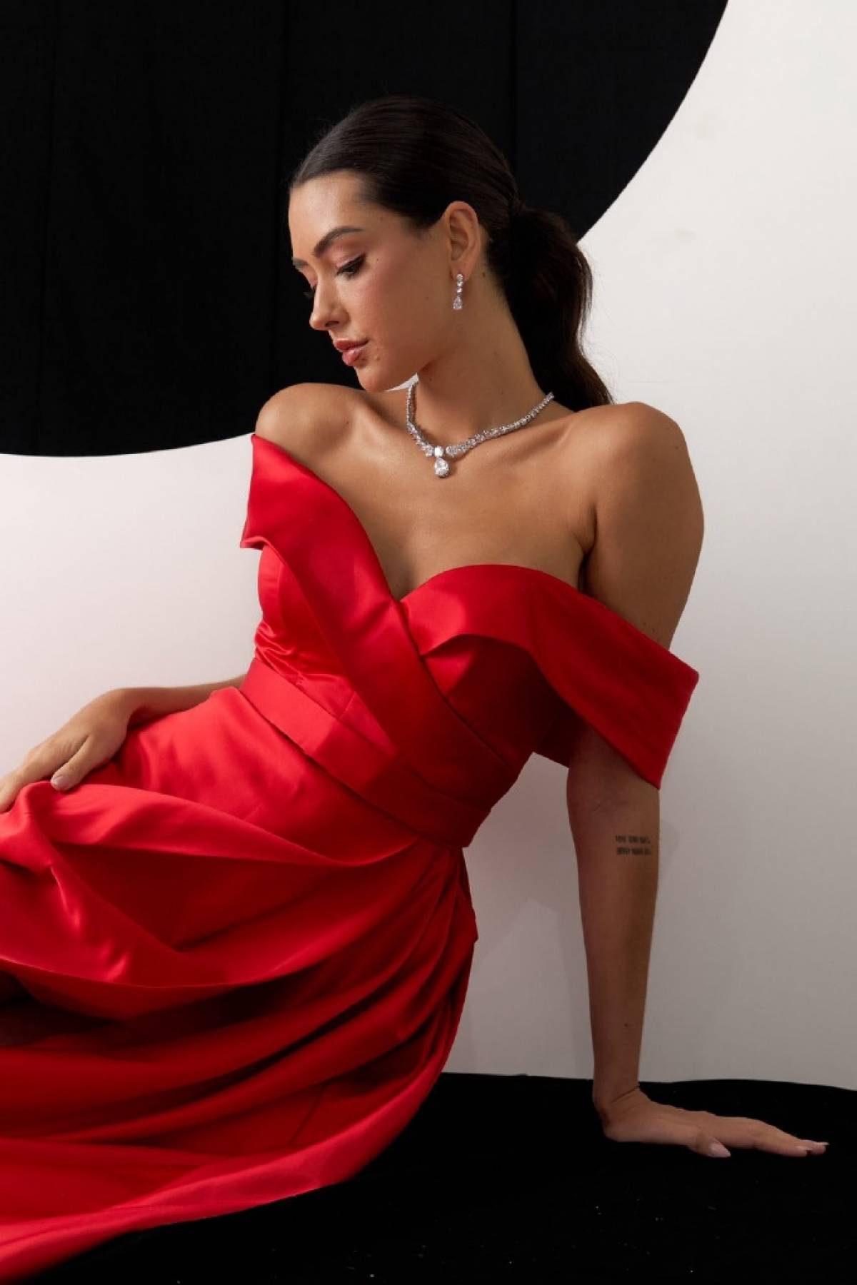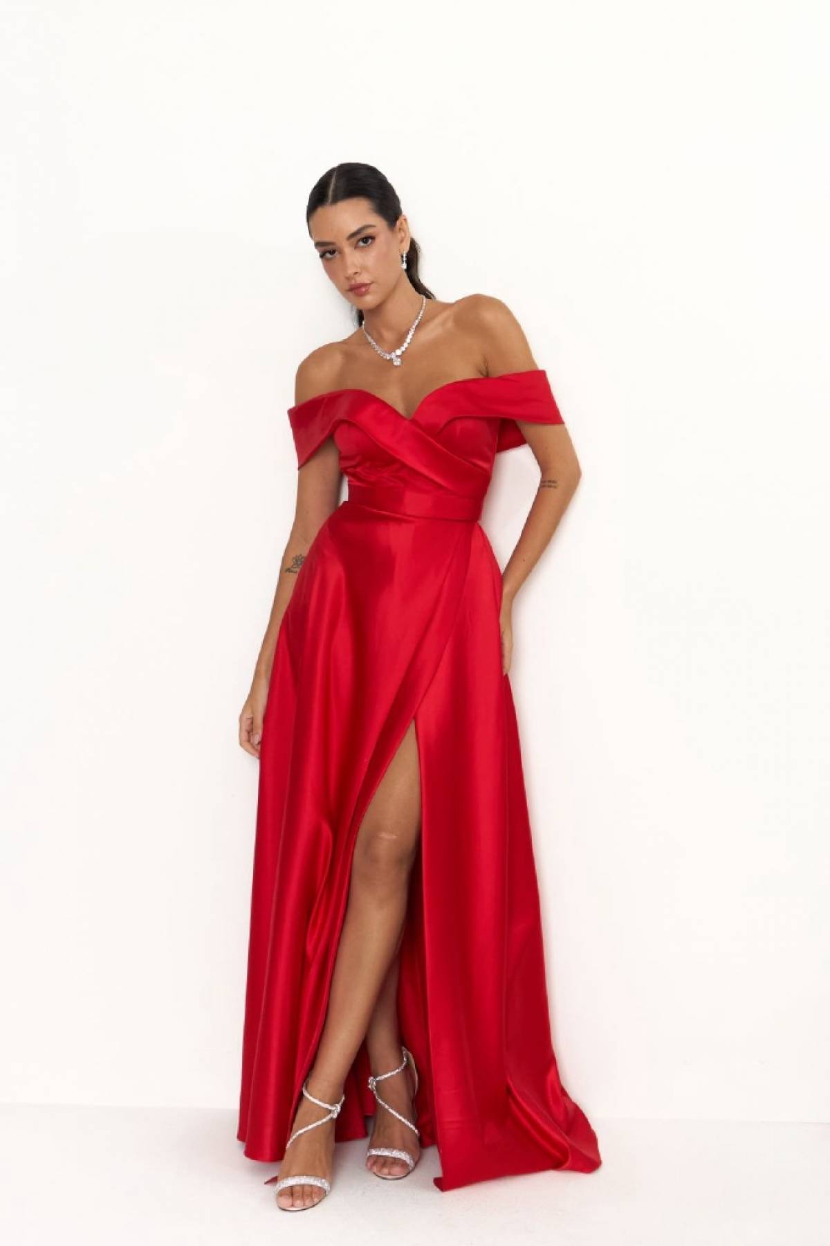 Descrição:Vestido longo em alfaiataria ombro a ombro com fenda. Vermelho, saia ampla