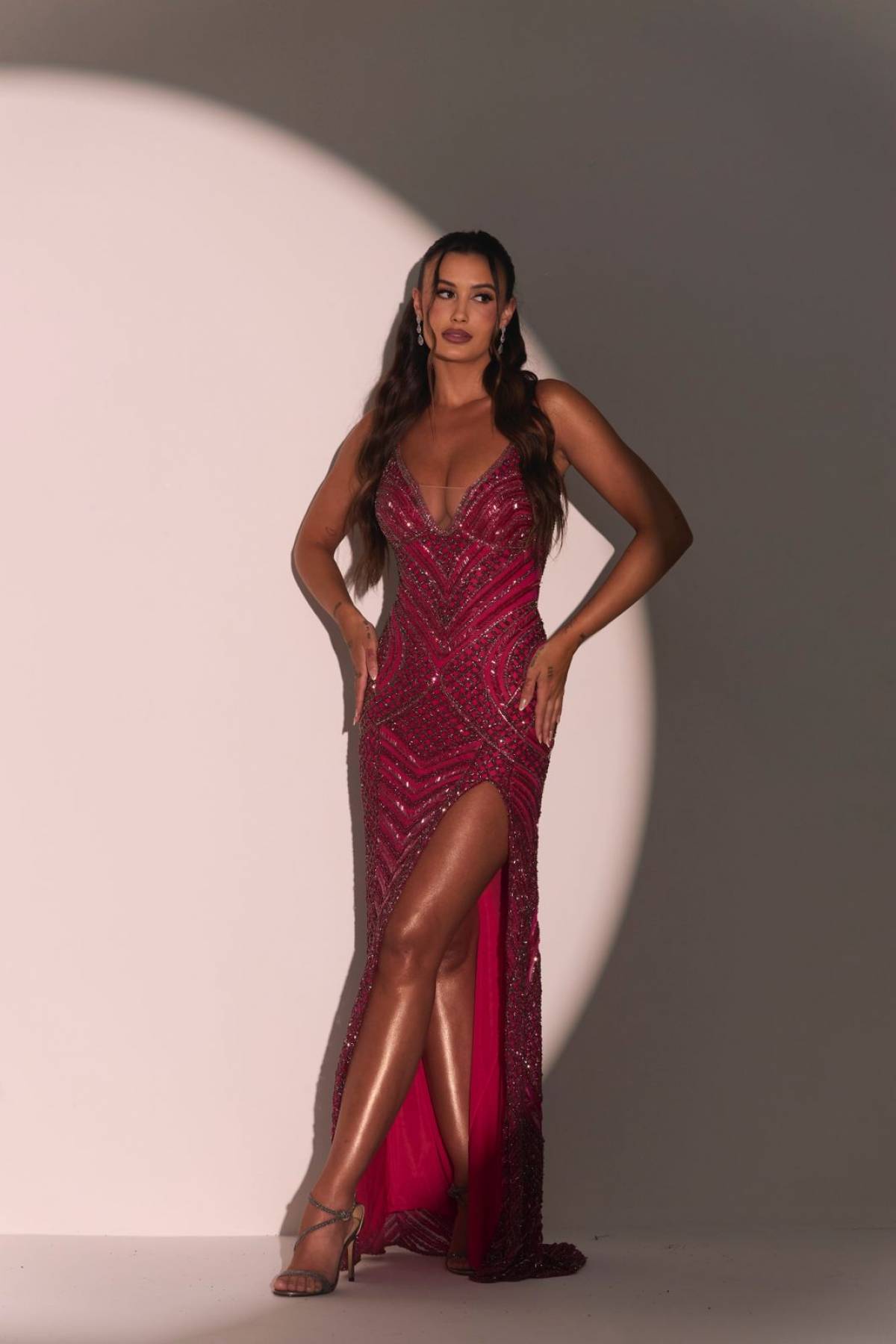 Descrição:Vestido longo liso, pink, tomara que caia, acetinado com aplicações em recorte 3d