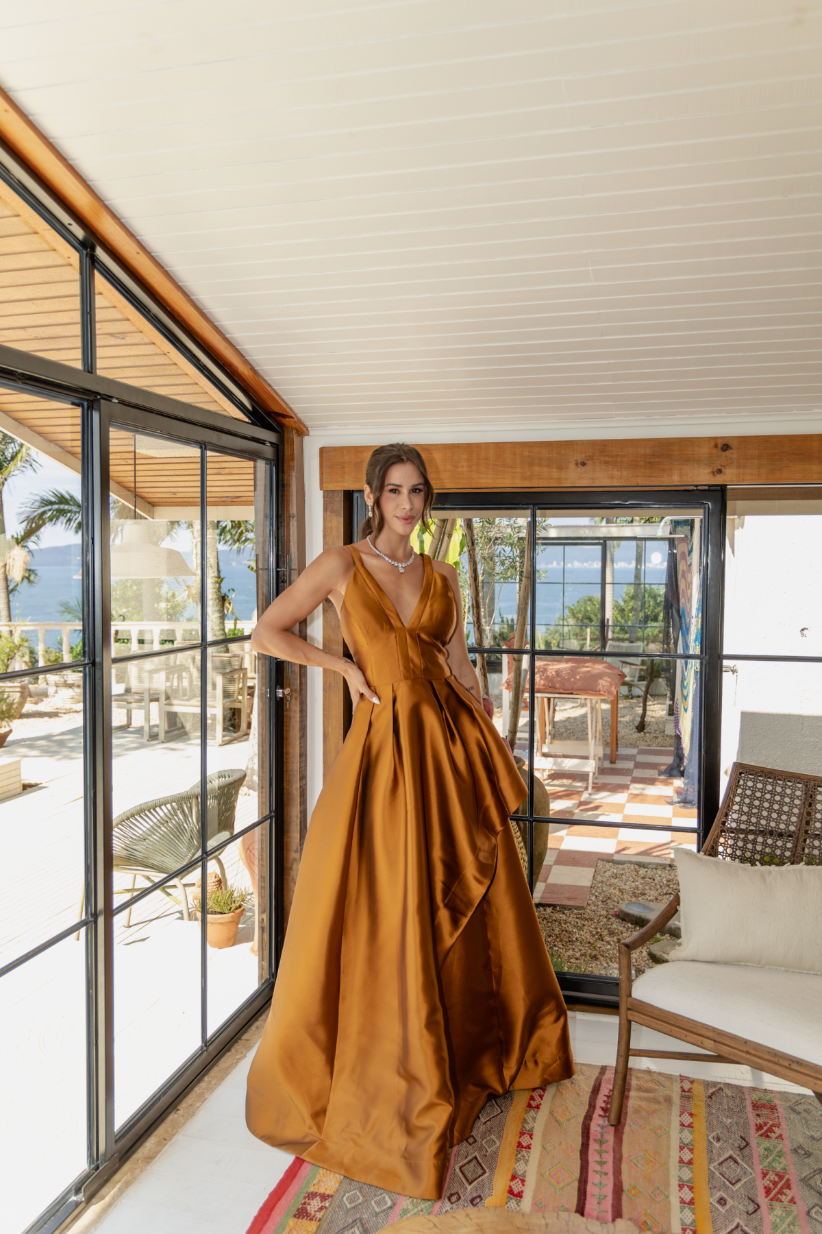 Descrição:Vestido longo liso, terracota/dourado, decote v, alfaiataria