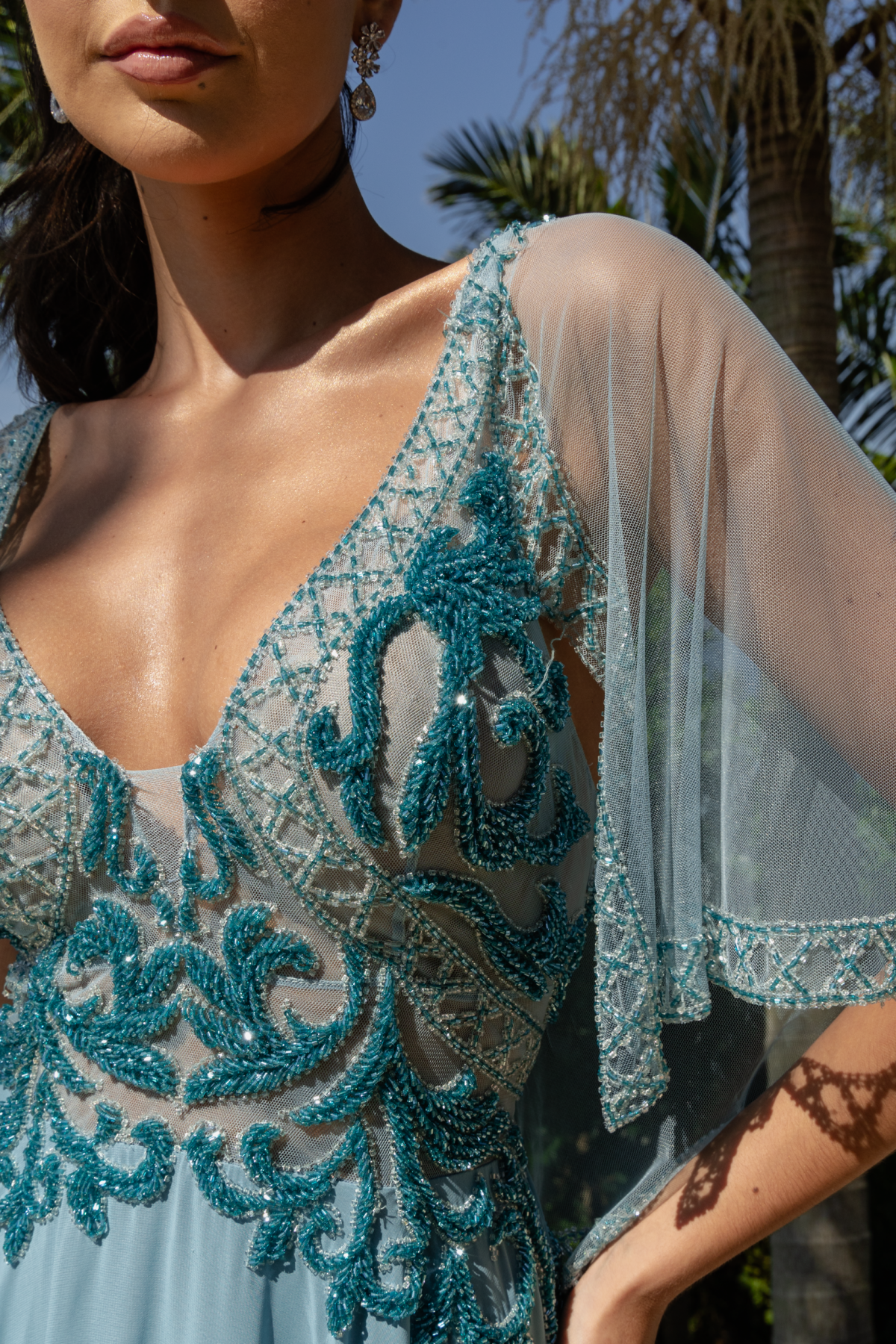 Descrição:Vestido azul tiffany com manga capa semi bordado fluido