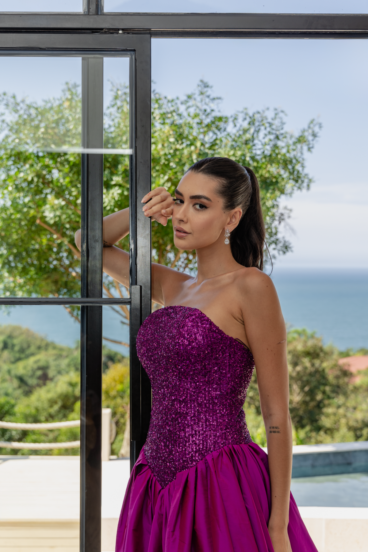Descrição:Vestido longo, fucsia, saia ampla, corset de paete, recorte princesa