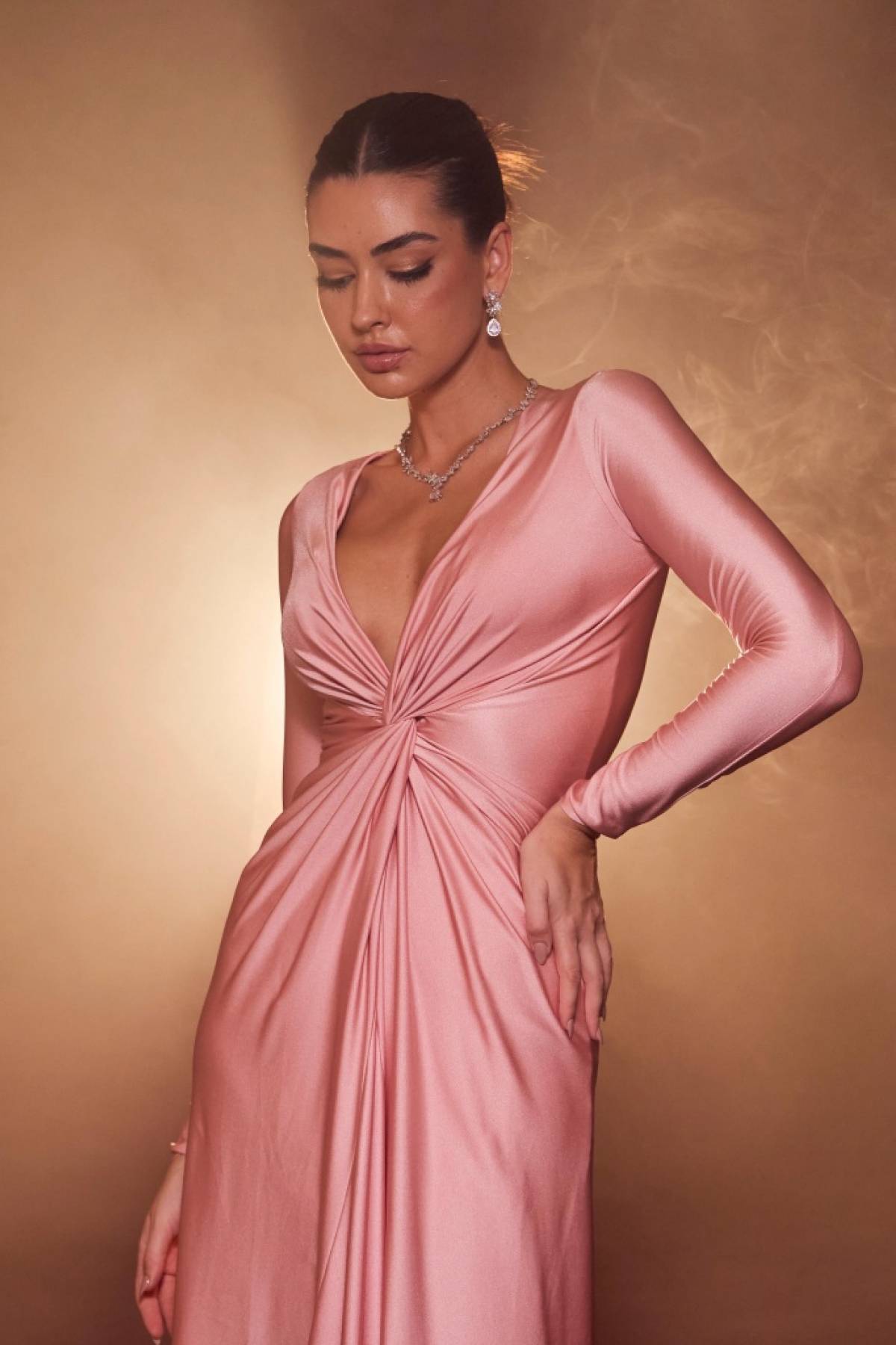 Descrição:Vestido longo rose, manga longa, liso, decote profundo