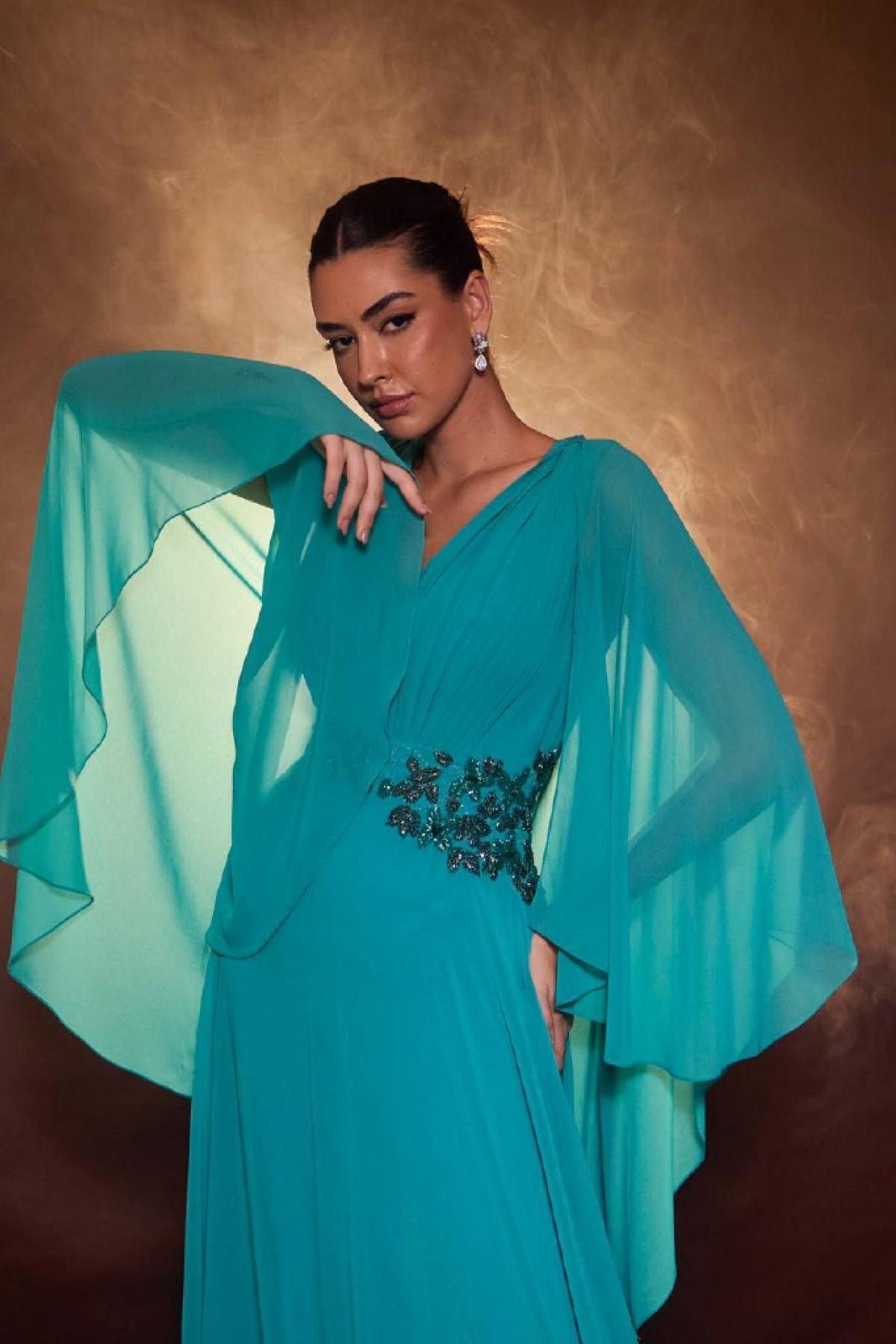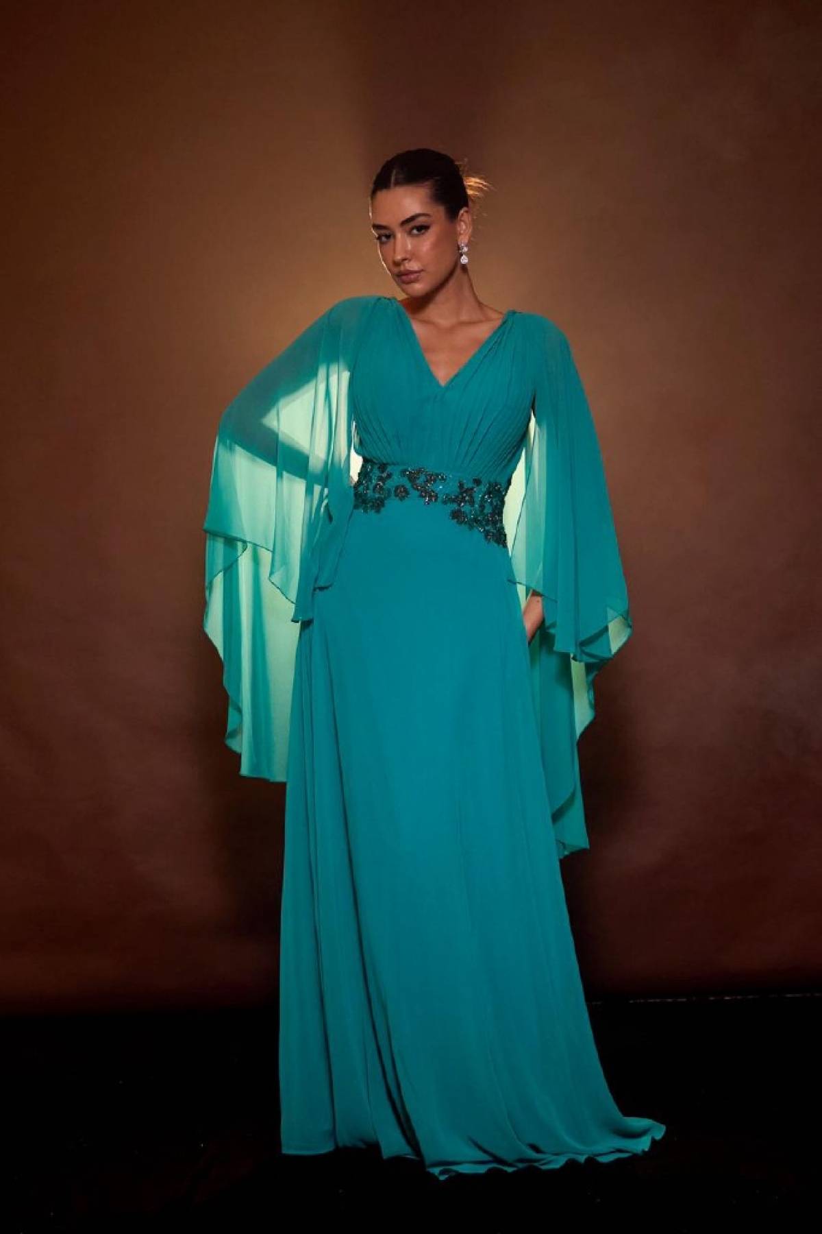 Descrição:Vestido longo verde/azul/tiffany, manga capa, decote v, bordado na cintura, drapeado no busto.