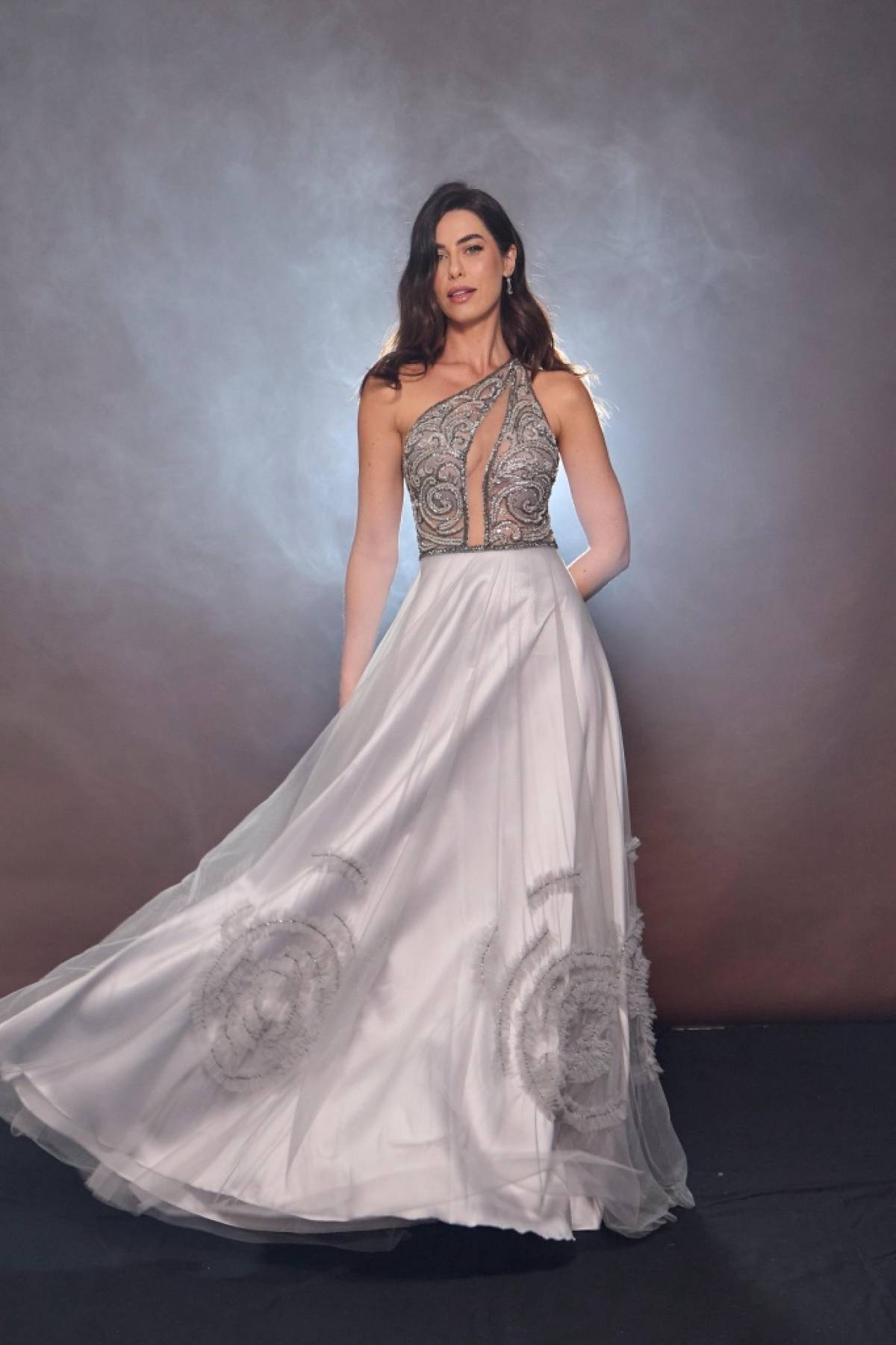 Descrição:Vestido de um ombro só, prata/cinza, semi bordado, decote em transparência, aplicação em 3d na saia em tule