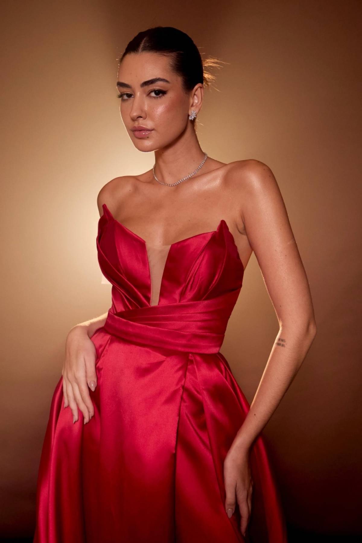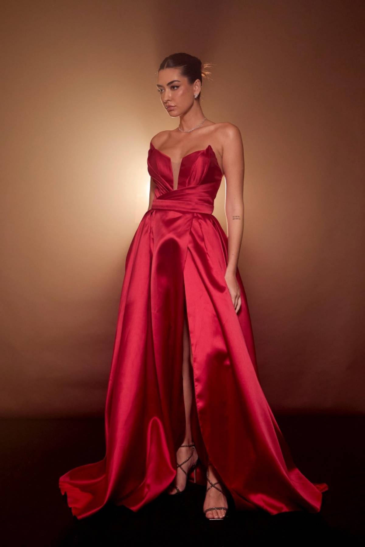Descrição:Vestido longo liso, em alfaiataria vermelho, saia ampla e decote profundo