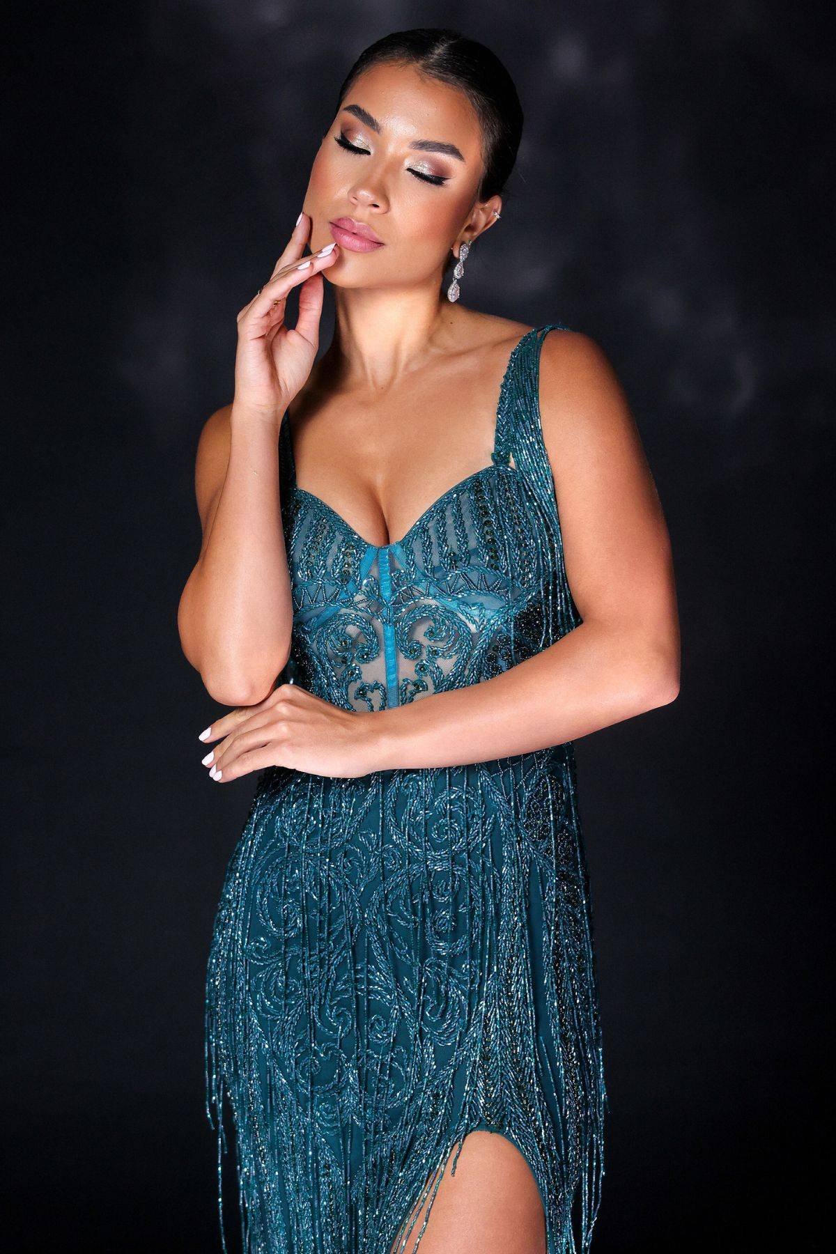 Descrição:Vestido inteiro bordado exclusivo My Closett, em pedrarias e cristais verde esmeralda / escuro, com franjas leves espalhadas no comprimento. Corset e fenda. Linha Select