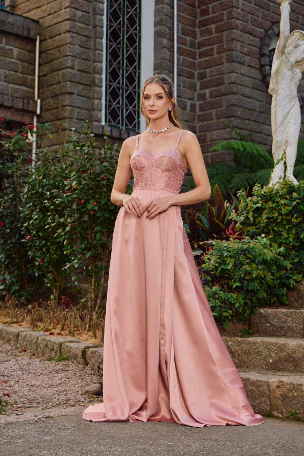 Descrição:Vestido longo rosê ombro a ombro sob medida, busto corselet, fenda lateral