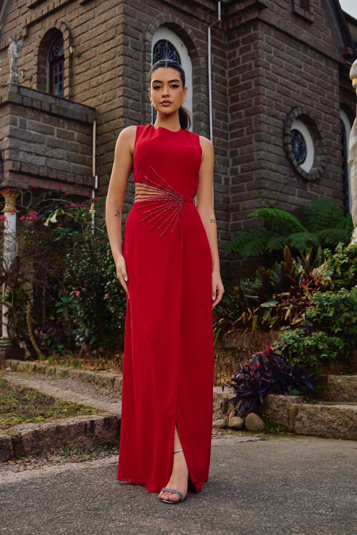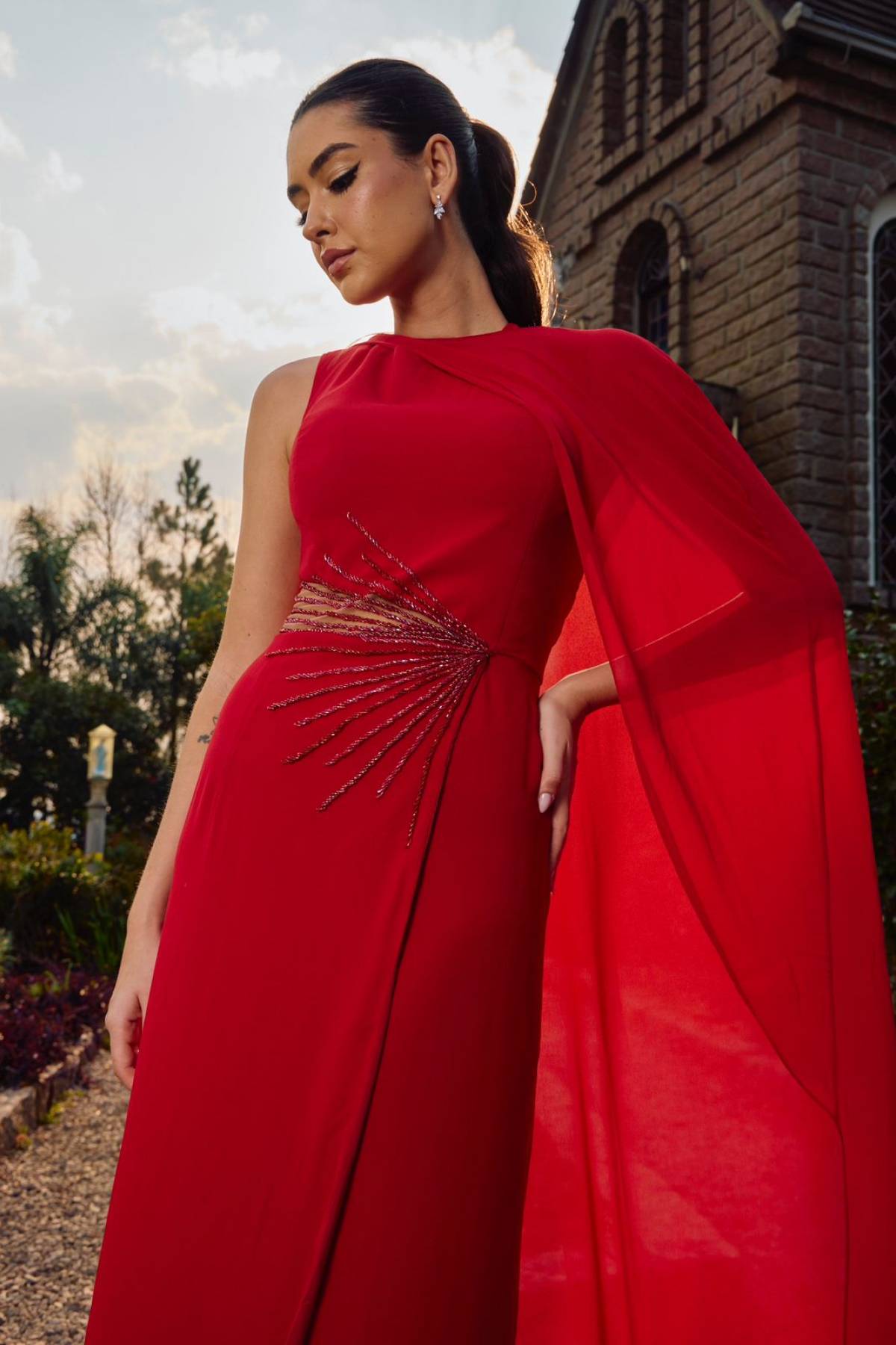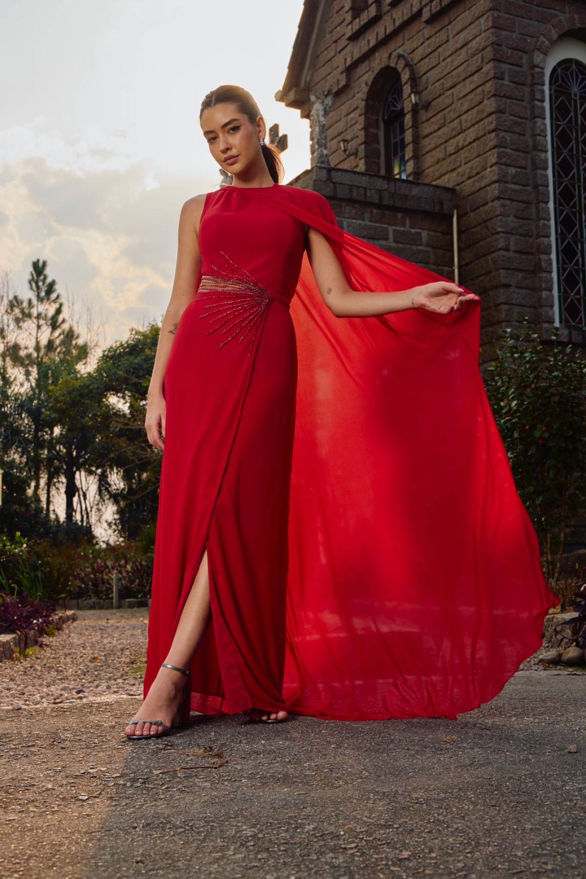 Descrição:Vestido longo vermelho, com capa, recorte na cintura, semi bordado, nó na cintura, saia transpassada