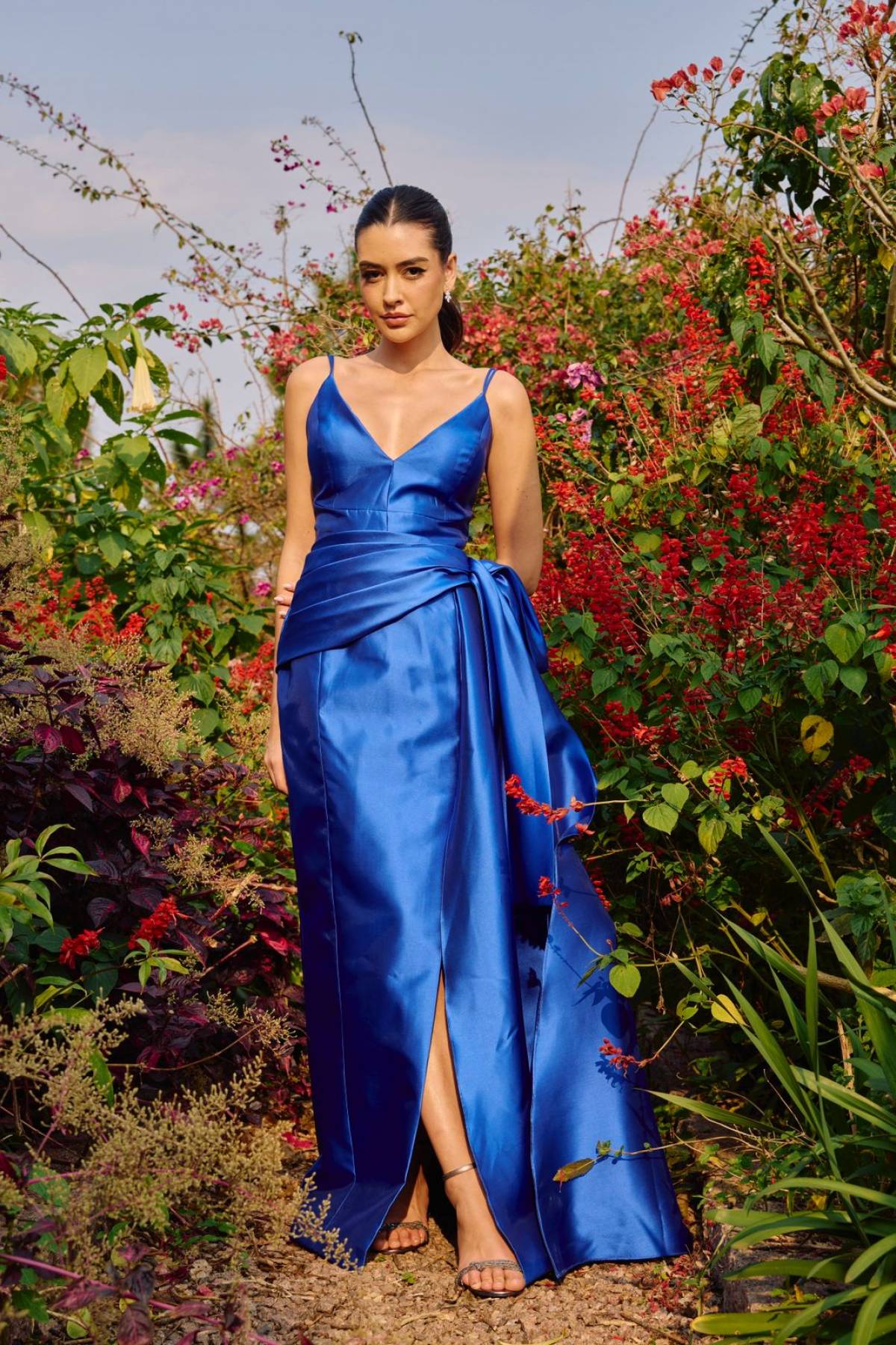Descrição:Vestido longo em alfaiataria, modelagem reta, decote v, laço lateral, azul klein ou royal, alça fina, fenda lateral