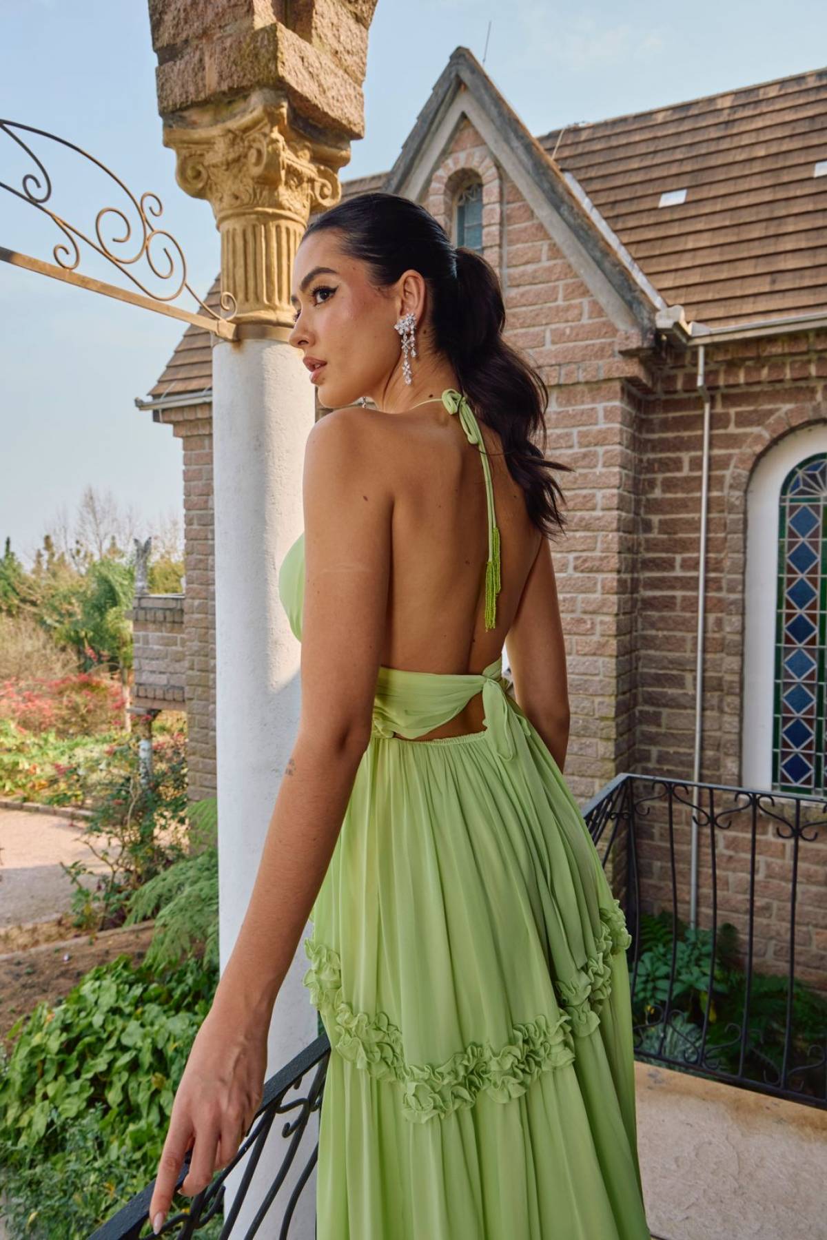 Descrição:Vestido longo liso lima, alça fina, cintura marcada, saia em camadas