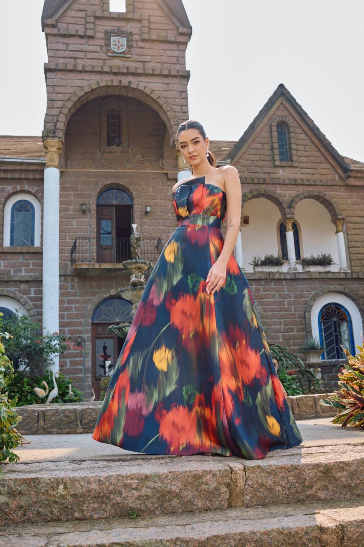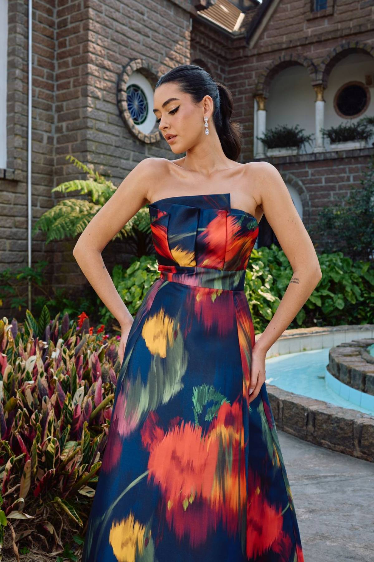 Descrição:Vestido longo em alfaiataria, estampado, drapeado no busto, assimetria, tomara que caia, cintura marcada, azul/colorido