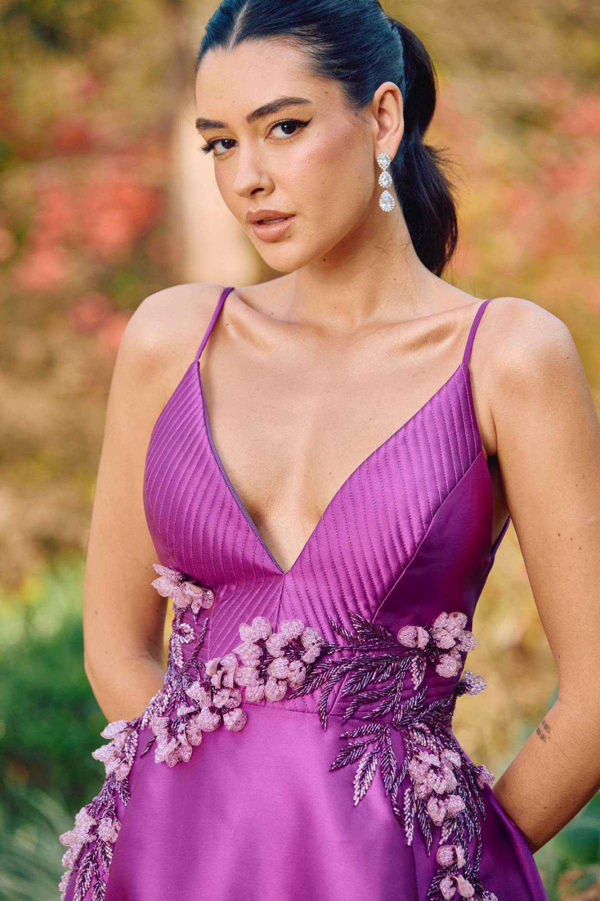 Descrição:Vestido longo fucsia, decote v profundo, alfaiataria, alças finas, semi bordados, cintura marcada