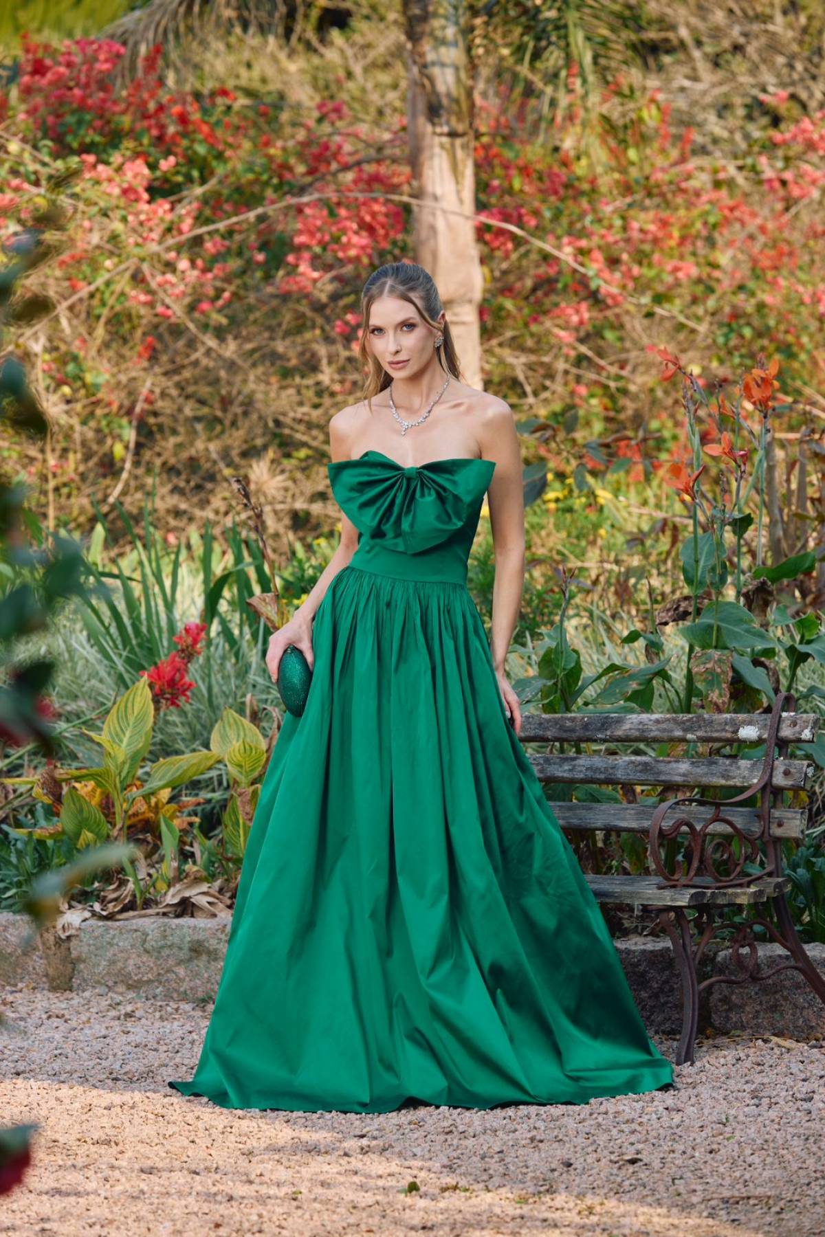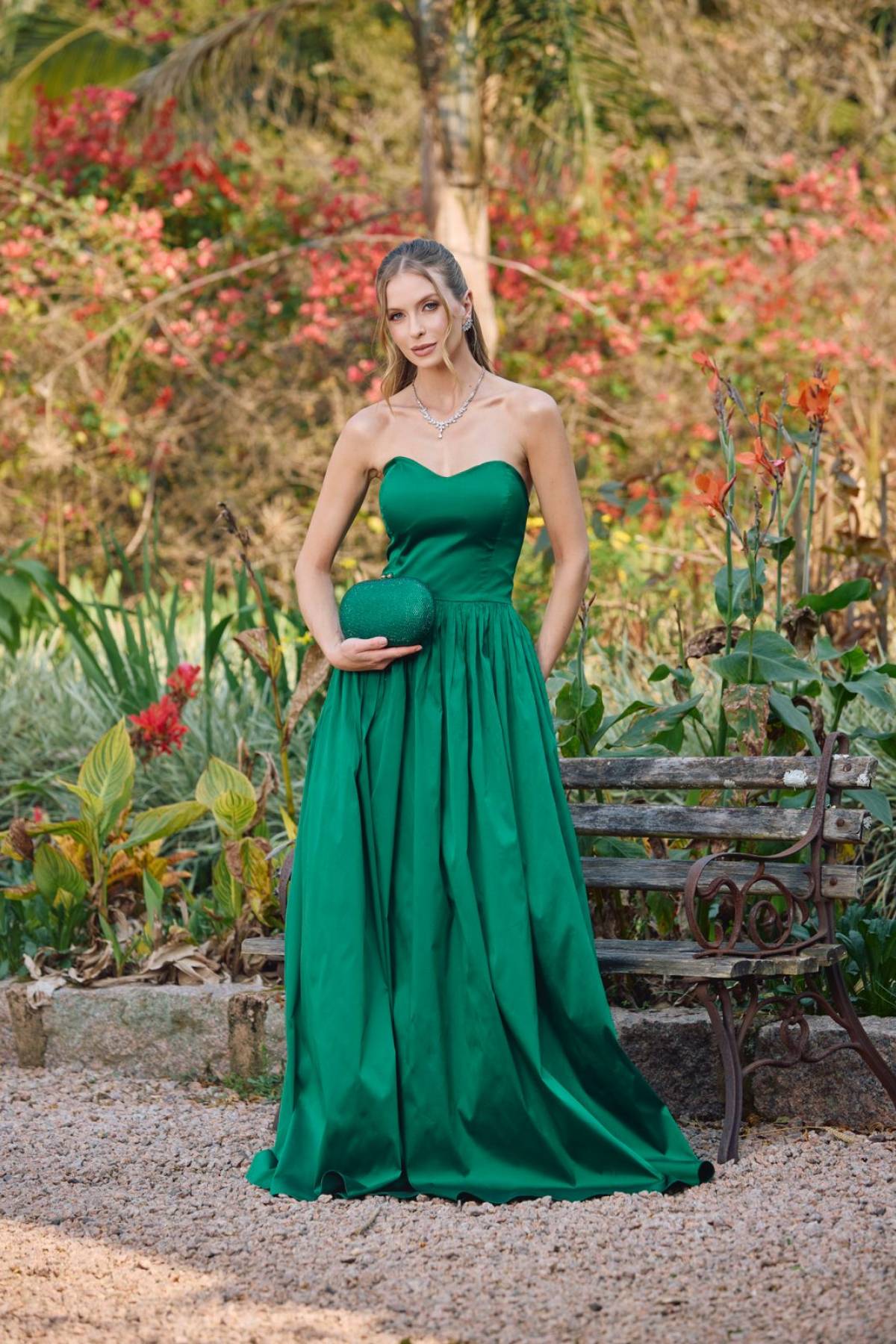 Descrição:Vestido longo verde, saia ampla, tafetá, tomara que caia, laço na lateral